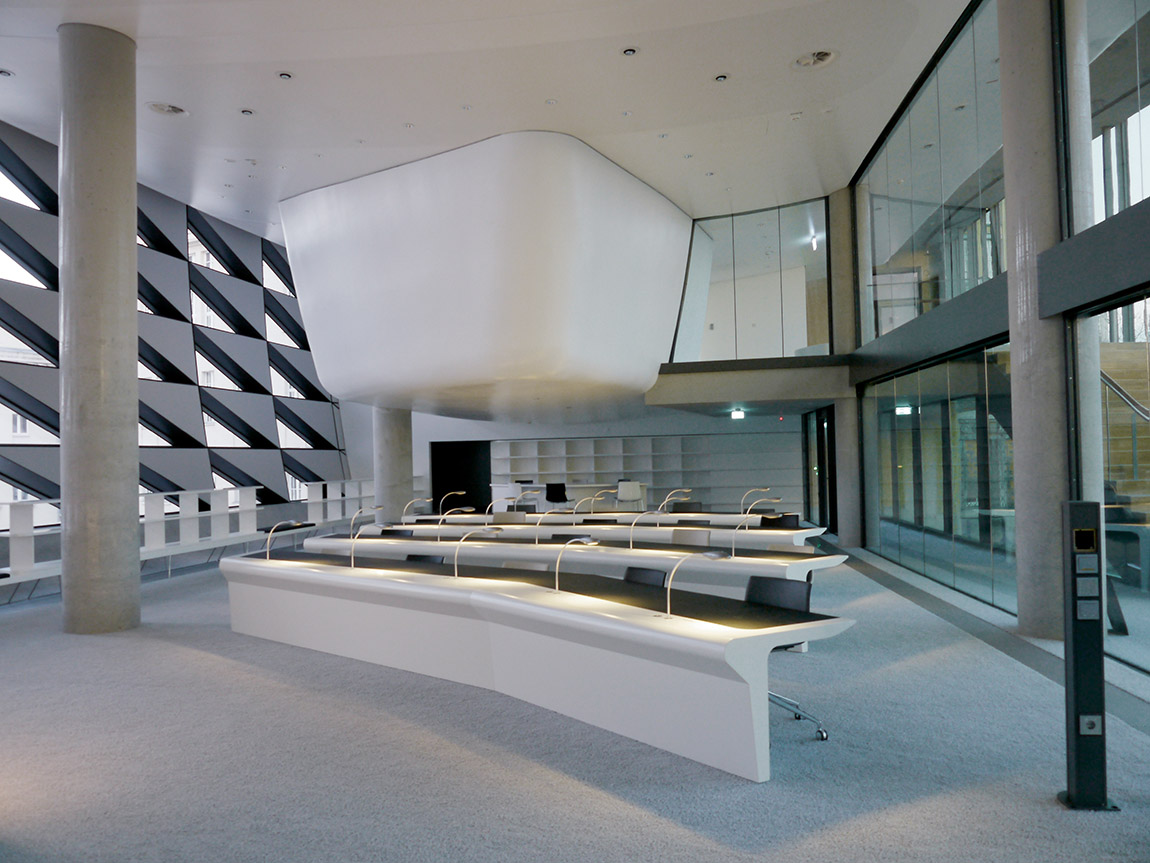 Ganz anders war die Aufgabe beim vierten Erweiterungsbau der Deutschen Nationalbibliothek in Leipzig. Der Baukörper sollte eine Verbindung schaffen: zwischen dem stadtplanerischen Erbe der DDR, zwei geschichtsbeladenen Bestandsgebäuden und den Anforderungen einer modernen Bibliothek. Ihr Konzept „Umschlag-Hülle-Inhalt“ übersetzte diese Vielfalt in eine dynamische Formensprache. „Ein frei geformter, dynamisch proportionierter Baukörper bildet Raumkanten und schlägt eine Brücke zwischen dem bestehenden Gebäude-Ensemble“, erzählt Gabriele Glöckler. „So konnte Raum für große, anspruchsvolle Büchermagazine geschaffen werden. Die Publikumsbereiche hingegen gehen räumlich fließend, nur durch einen Glasvorhang getrennt, in den Stadtraum über.“