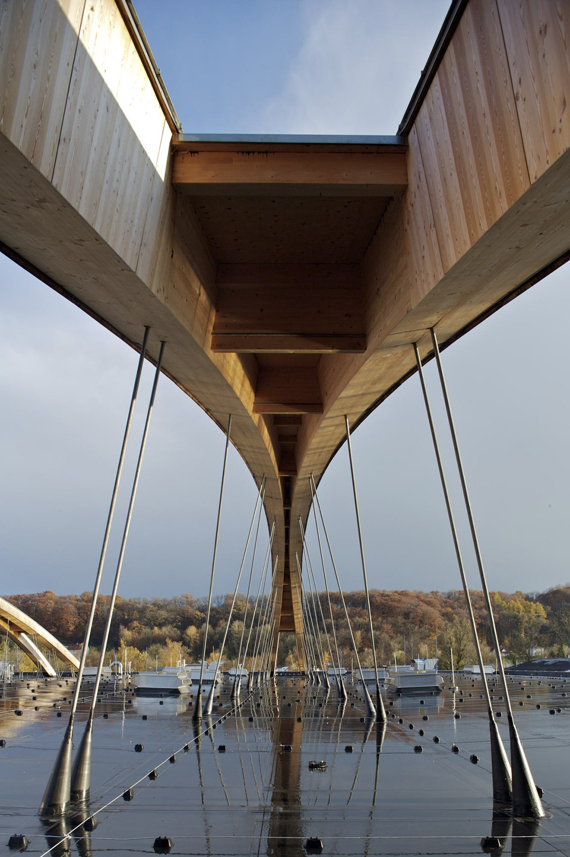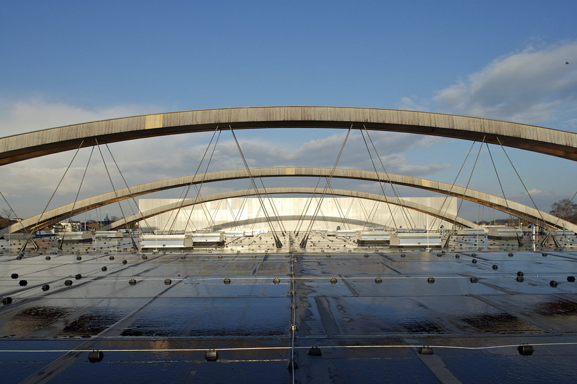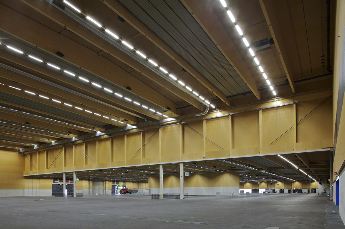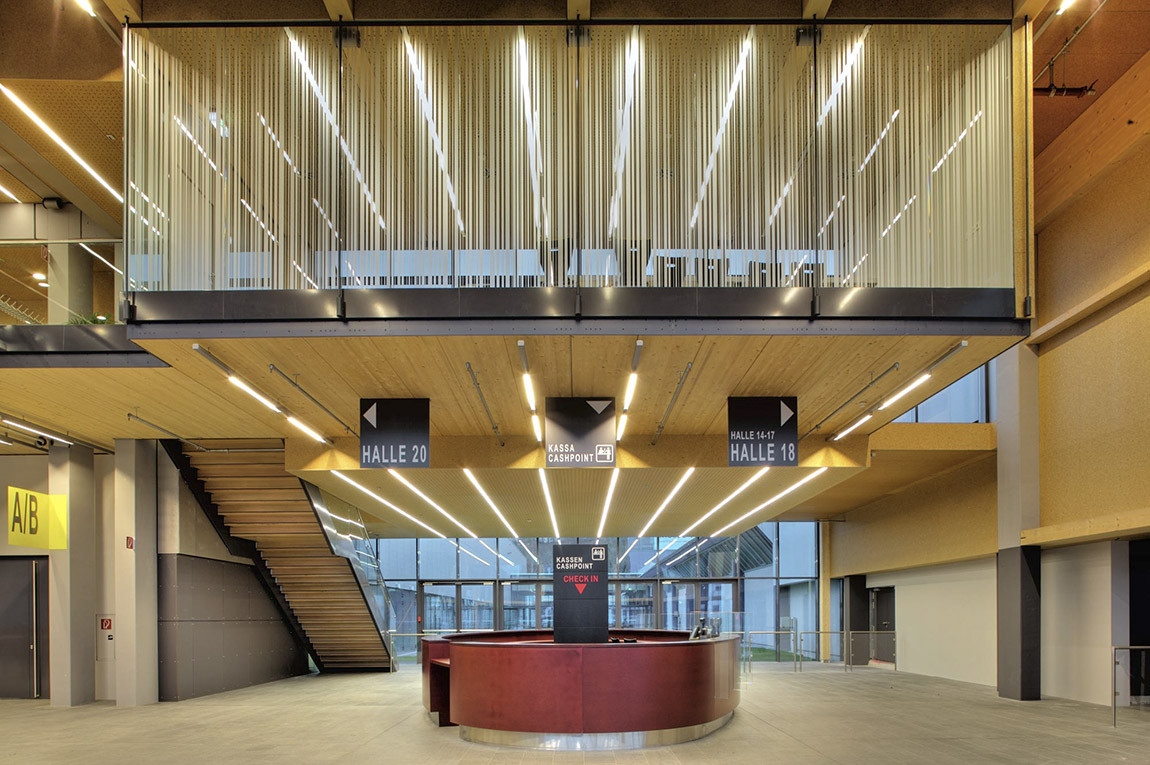 Ein bisher zusammenhangloser Messebereich erhält seine optische Fassung. Die Vorstellung von einer zeitgemäßen Halle umgesetzt, beginnt das Konzept im langgestreckten, transparent- lichtdurchfluteten Foyer, das zum angenehm großzügigen Wandelgang wird. Räumliche Verschränkungen mit dem Tagungsbereich im Obergeschoss, die Integration der Cafés und der beiden Restaurants auf einer zusätzlich eingezogenen, offenen Ebene, sowie eine allgegenwärtige Durchlässigkeit ermöglichen die Teilnahme am Geschehen in der Halle von fast jedem Punkt aus, wahlweise auch den Bezug zur Straße und zum Außenbereich.