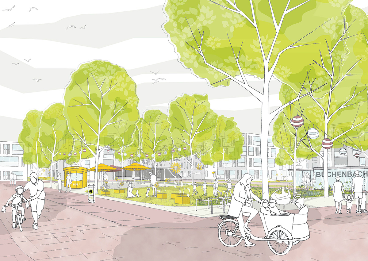 Wie moderne Stadtplanung funktioniert, zeigen Eckert und Dömges Architekten AG mit dem Projekt Quartier Breite Äcker in Büchenbach. Hier bilden sechs zueinander verschobene Baufelder eine grüne Quartiersmitte mit Pavillons, die kulturelle und nachbarschaftliche Begegnungen fördern. Nachhaltigkeit steht bei diesem Projekt klar im Fokus: Holzbauweise und gemeinschaftlich genutzte Dachgärten und Gewächshäuser sind Teil des Konzepts. Ein dichtes Netz von Fuß- und Radwegen sowie Mobilitätsstationen sorgt für eine klimagerechte Infrastruktur.