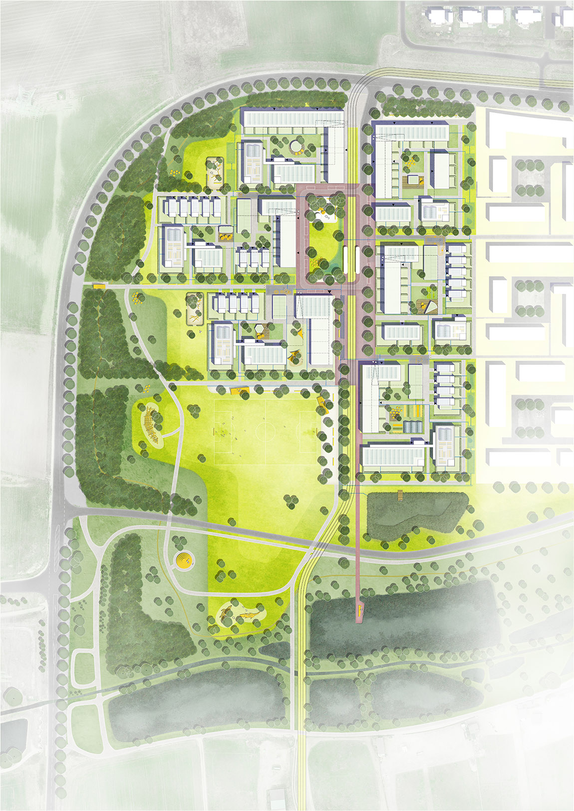 Eckert and Dömges Architekten AG demonstrate modern urban planning with their project Quartier Breite Äcker in Büchenbach. Six staggered building zones form a green central space with pavilions that promote cultural and neighbourly encounters. Sustainability is a key focus, integrating timber construction, communal rooftop gardens, and greenhouses. A dense network of pedestrian and cycling paths, along with mobility stations, provide an eco-friendly infrastructure.