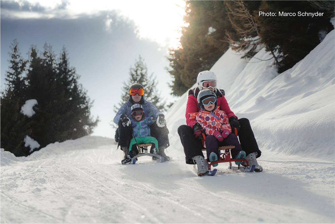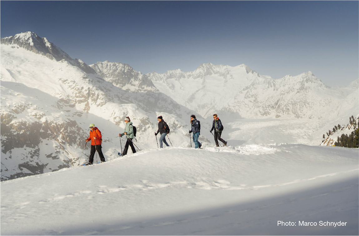 For years, the car-free villages of the Aletsch Arena have been awarded first place in the satisfaction ranking of the Top 55 ski areas in the ‘rest and relaxation’ category, and second place in the ‘nature experience’ category, in the ‘Best Ski Resort’ report from Mountain Management Consulting in collaboration with Innsbruck University. The reasons for this high satisfaction are plentiful: not only does the region impress with 72 kilometres of well-prepared winter hiking trails, it also offers snowshoe trails, cross-country skiing, sledging, night ski trips as well as snow tubing.