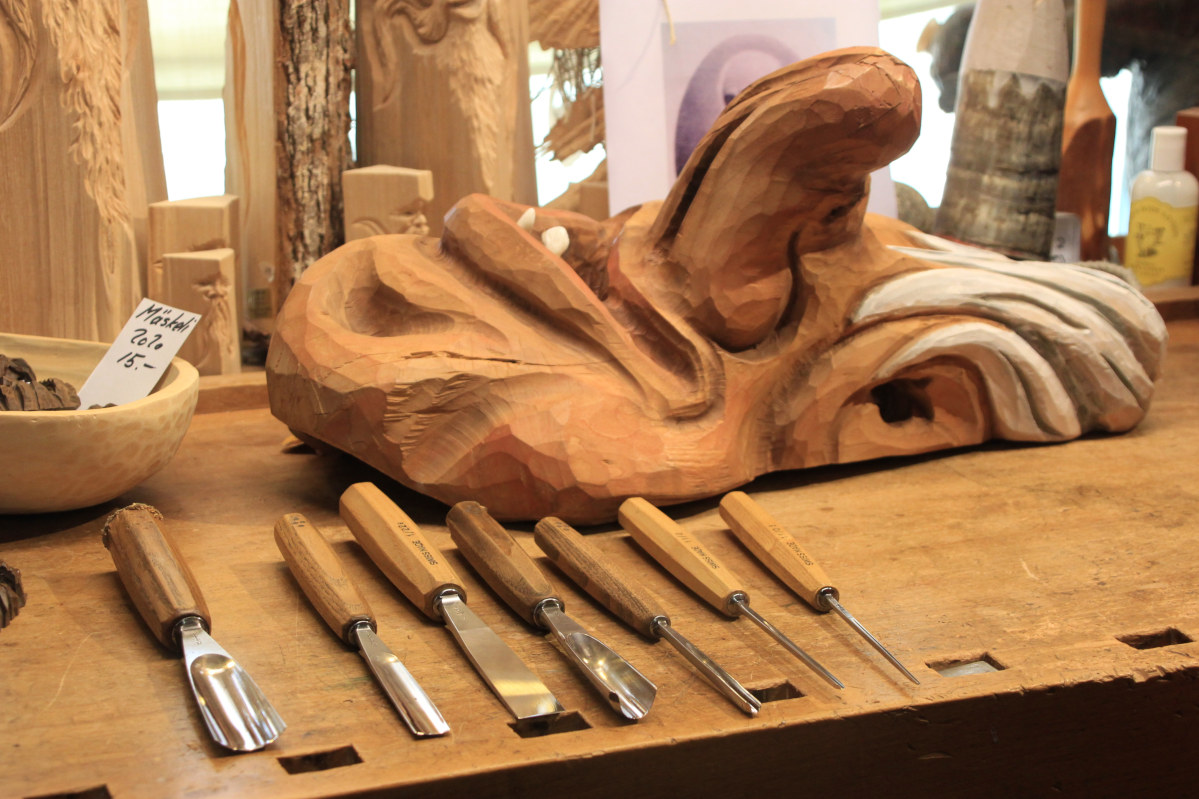 Gabriela Schild – Harder-Potschete mask in progress and chisels. Photo: © Wibke Carter