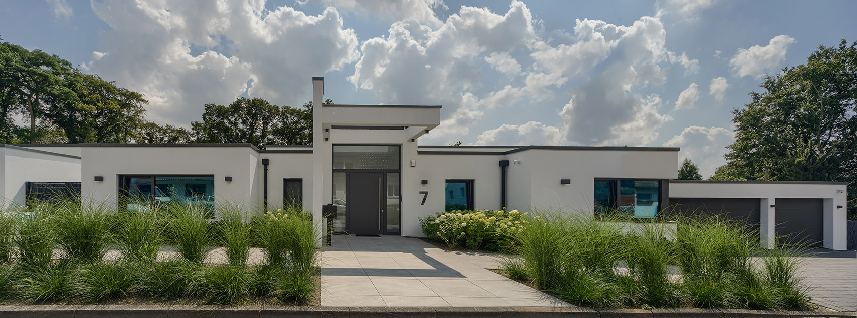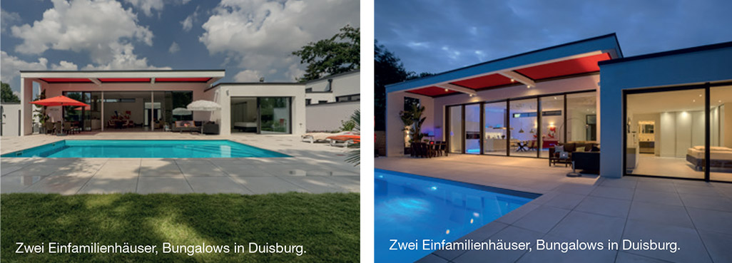 Zwei weitere Einfamilienhausbeispiele, die den individuellen Baustil des Architekturbüros darstellen, stehen ebenfalls in Duisburg. Zwei großzügige Bungalows wurden hier nebeneinander gebaut, die vom Fußboden bis zur Decke verglaste Außenwände und Minimalfenster mit schmalen Rahmenpro-gefilen integrieren, sodass die Innen- und Außenräume nahezu verschmelzen und einen wunderbaren Blick auf das herrliche Sonnengrundstück mit altem Baumbestand eröffnen. Gestalterisch ähneln sich die Bungalows zwar, sind jedoch durch verschiedene Fassadengestaltungen gleichzeitig absolute Unikate. Während ein Haus mit einer weißen Glas-Steinfassade imponiert, ist der zweite Bungalow mit einem dunklen schmalen Verblendstein geschmückt, der optisch mit dem weißem Putz harmoniert.