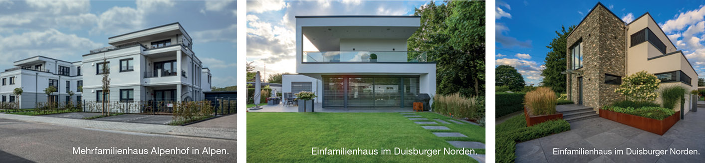 Dass Mehrfamilienhäuser nicht langweilig sein müssen, beweist das Architekturbüro aus Moers mit dem ‚Alpenhof‘ in Alpen am Niederrhein. Das Gebäude umfasst 13 Eigentumswohnungen und erfüllt durch eine leistungsstarke Erdwärmepumpe die Kriterien als kfw-55 Effizienzhaus. Alle Wohnungen wurden barrierefrei geplant und mit Tageslichtbädern und großen Balkonen beziehungsweise Dachterrassen ausgestattet. Ein imposantes Erscheinungsbild entsteht durch die Fassade mit Bossensteinoptik und Stuckelementen, sowie den mit Solitärbäumen bepflanzten Eingangshof. Stahlmann erklärt: „Wir verstehen Planen und Umsetzen eines Hausbaus primär nicht als Kunstwerk, sondern als sorgfältige und gewissenhafte Anwendung von Fachwissen. Wir hören gut zu und setzen das Gesagte gut um. Wir planen nicht unseren, sondern den individuellen Stil und entwerfen Raumdetails, die den Unterschied machen.“
