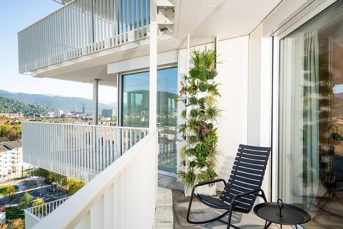Überragend – das beschreibt den 16-stöckigen Black F Tower, Freiburgs erstes klimaneutrales Gebäude, am treffendsten. 50.000 immergrüne Pflanzen bilden Deutschlands größte begrünte Fassade, auf dem Dach sind vier Bienenvölker zuhause. Innen sorgen Naturmaterialien und eine fünf Meter hohe Birkenfeige für ein nachhaltiges Wohnklima. Hinzu kommen ausdrucksstarke Schwarzwald-Kunst regionaler Künstler sowie stilvolle Chillout-Zonen in der Lobby oder auf der Dachterrasse, die für die Arbeit oder Freizeit genutzt werden können.