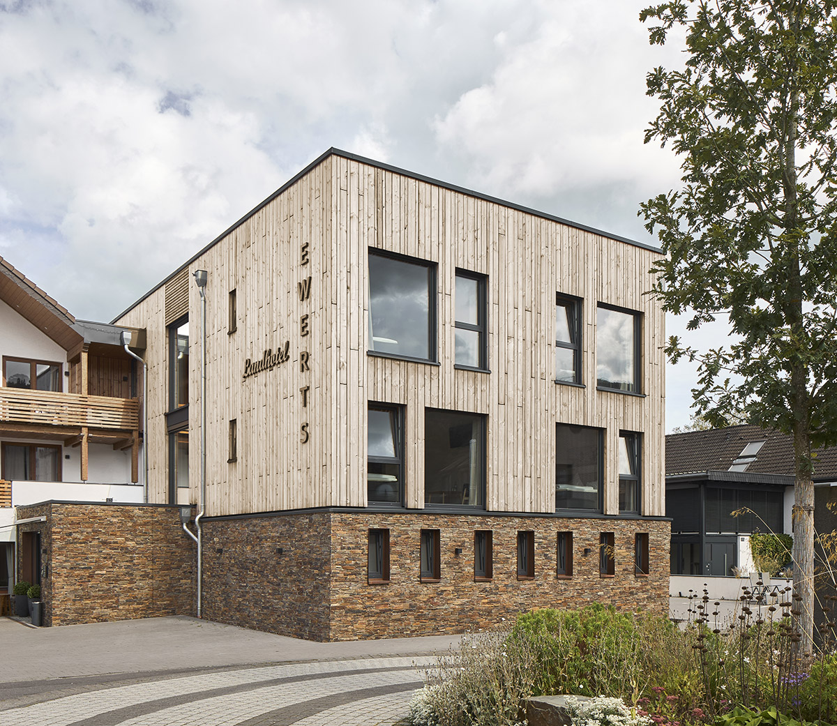 Aktuelle Beispiele finden sich unter anderem im leidgeprüften Ahrtal: Das Landhotel Ewerts in Insul liegt idyllisch am Flussufer und war damit von der Flutkatastrophe 2021 direkt betroffen. Sowohl der alte Baumbestand, die Außenanlagen und das gesamte Erdgeschoss wurden von den Wassermassen zerstört. Nach einer Rückführung des Gebäudes in den Rohbau wurden die Räumlichkeiten mit ansässigen Unternehmen neu organisiert und umgestaltet, sowie ein zur Straße orientierter Anbau durch eine Hotelerweiterung ersetzt. So entstanden eine neue Lobby und insgesamt 5 neue Zimmer in den oberen Geschossen. Das Erdgeschoss des Hauptgebäudes wurde massiv ausgebildet und mit einer ortstypischen Grauwacke-Fassade versehen, während die Obergeschosse im Holzrahmenbau errichtet und mit einer modern interpretierten Lärchen- Fassade versehen wurden.