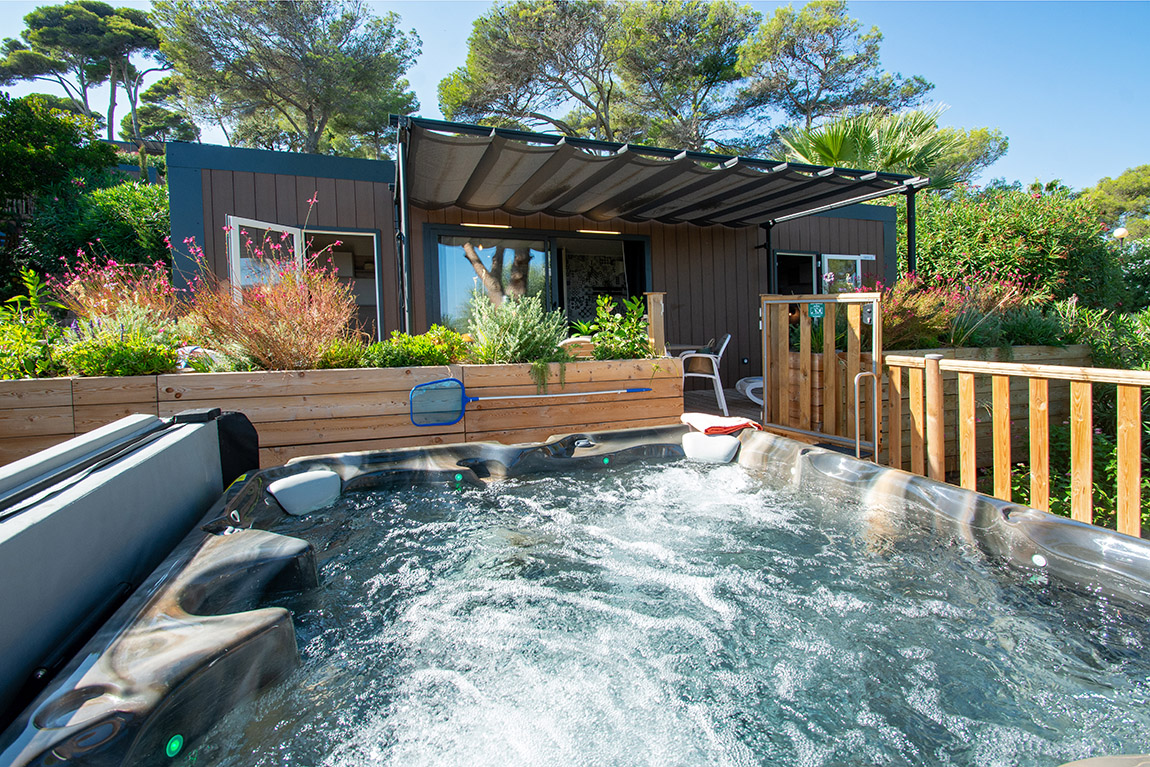 Besides the exceptional accommodation options, guests can look forward to a wide range of activities within Camp du Domaine and beyond. On the beach, water sports such as kayaking, sailing or snorkelling are offered, while those without sea legs can explore the surrounding footpaths and cycling routes instead. Back at the campsite sports activities await, including yoga and fitness classes, tennis courts, as well as wellness and beauty treatments, and access to a spa with sauna, hammam and whirlpool. For the night owls, evening entertainment venues host concerts and shows for a great time out. And, as the largest family campsite on the Côte d’Azur, Camp du Domaine offers playgrounds, clubs and an entertainment programme led by a team of qualified activity leaders for the little ones. “We ensure unforgettable holidays for the whole family,” explains Monsieur Defour.