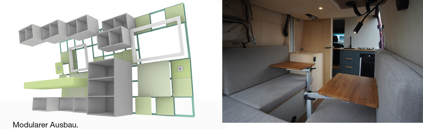 Eine Rippenkonstruktion, die an der Karosserie des Campervans angebracht wird, schafft die Basis für den Ausbau – unabhängig vom Fahrzeugmodell. Als nächstes werden die gewünschten Möbelmodule am Anschlusssystem befestigt. Ändern sich die Reisegewohnheiten, ändert sich der Campervan einfach mit. Ein zusätzliches Bett für ein Abenteuer mit Freunden ist kein Problem.