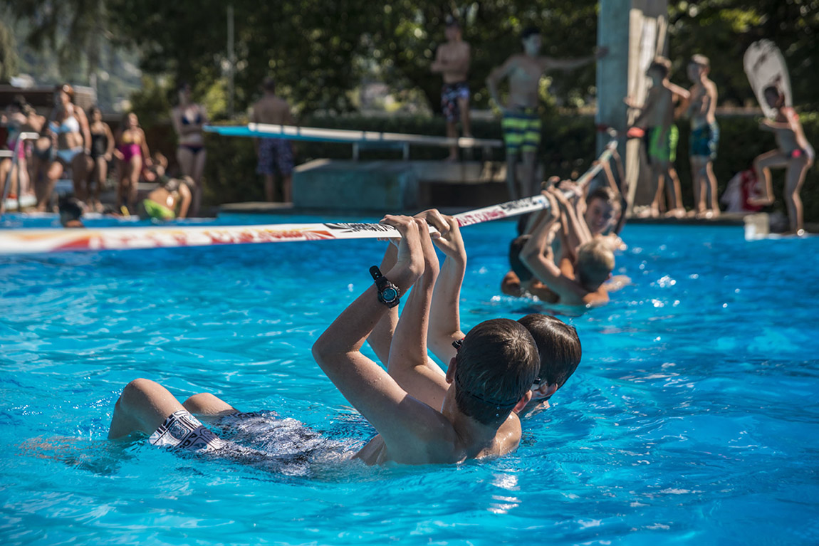 Das Schwimmbad des Campingplatzes bringt Sportfans, aber auch Familien und Kindern an heißen Sommertagen die dringend benötigte Abkühlung. Im 50-Meter-Becken schwimmen die Erwachsenen ihre Bahnen, während sich die Kinder auf der Rutschbahn (45 Meter lang!), dem Sprungturm, bei den Wasserfontainen oder im Kinderbecken nach Herzenslust austoben können. Auf der großen Liegewiese, auf der ausladende Bäume genügend Schutz vor der Sonne bieten, kann man die Seele baumeln lassen. Beim Schwimmen oder Toben verlorengegangene Energie werden ganz einfach im Restaurant aufgeladen. Hier stellen sich dann die Fragen: Pizza oder Paella? Grillgemüse oder Raclette? Mit seinen frischen und gesunden Speisen, mit knackigen Salaten, Frappès und leckeren Cocktails und Eisbechern ist das Restaurant der perfekte Rahmen für einen gelungenen Sommerurlaubstag.