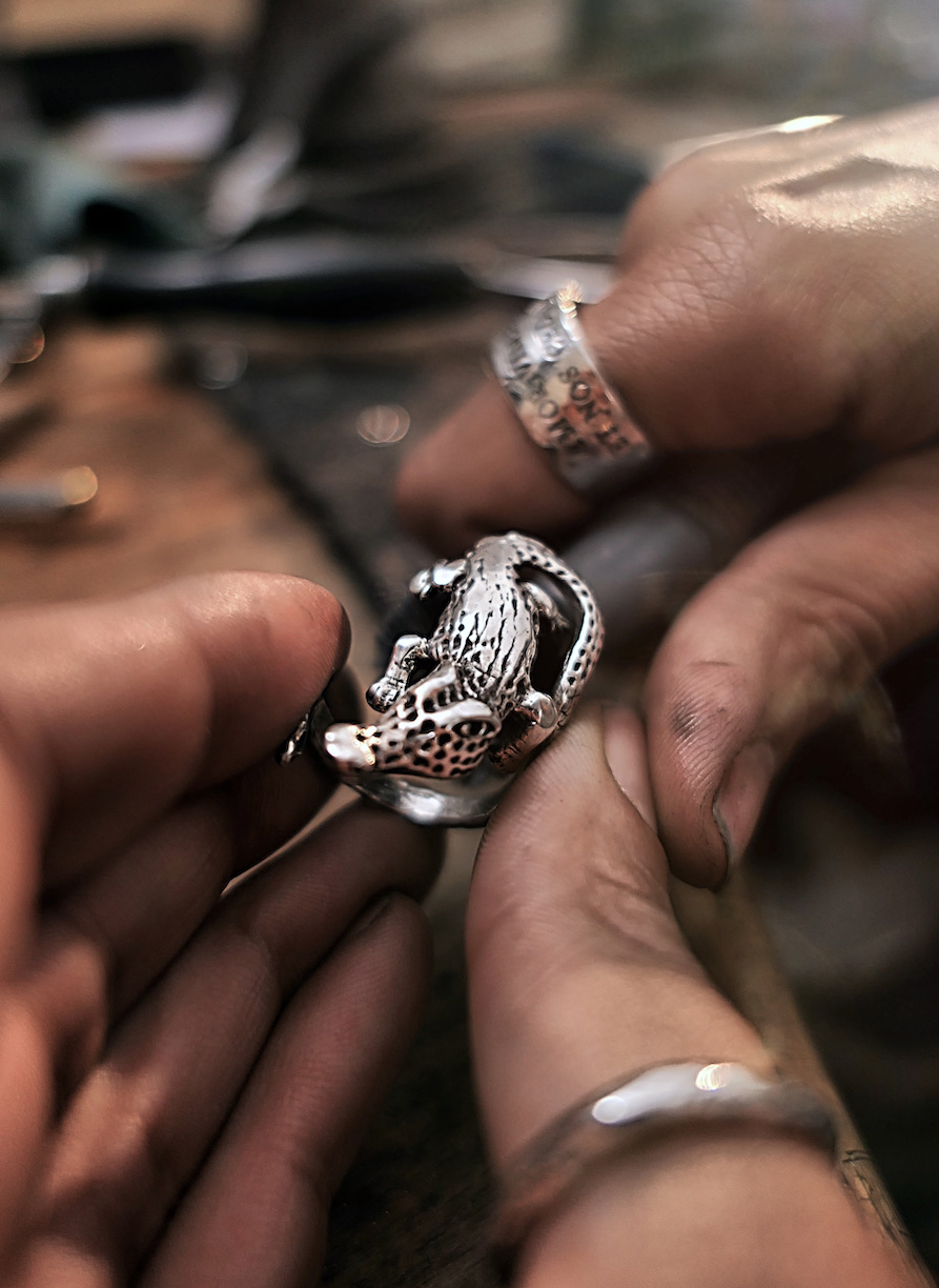 CAPULET hebt sich durch seinen unnachahmlichen Stil und die kompromisslose Qualität seiner Materialien ab. Jedes Schmuckstück wird aus RJC-zertifiziertem Gold und Silber gefertigt – ein Garant für ethisch einwandfreie Ressourcen. Das Markenzeichen? Stark gehämmerte Oberflächen und personalisierte Gravuren, die eine tiefe Verbindung zum Schmuckstück schaffen. „Genau genommen gravieren wir nicht bei CAPULET, sondern wir punzieren“, erklärt Nina. „Also jeder Buchstabe wird einzeln von Hand in das Gold oder Silber eingeschlagen. Sehr viel Arbeit, aber immer ein wunderschönes Ergebnis.“