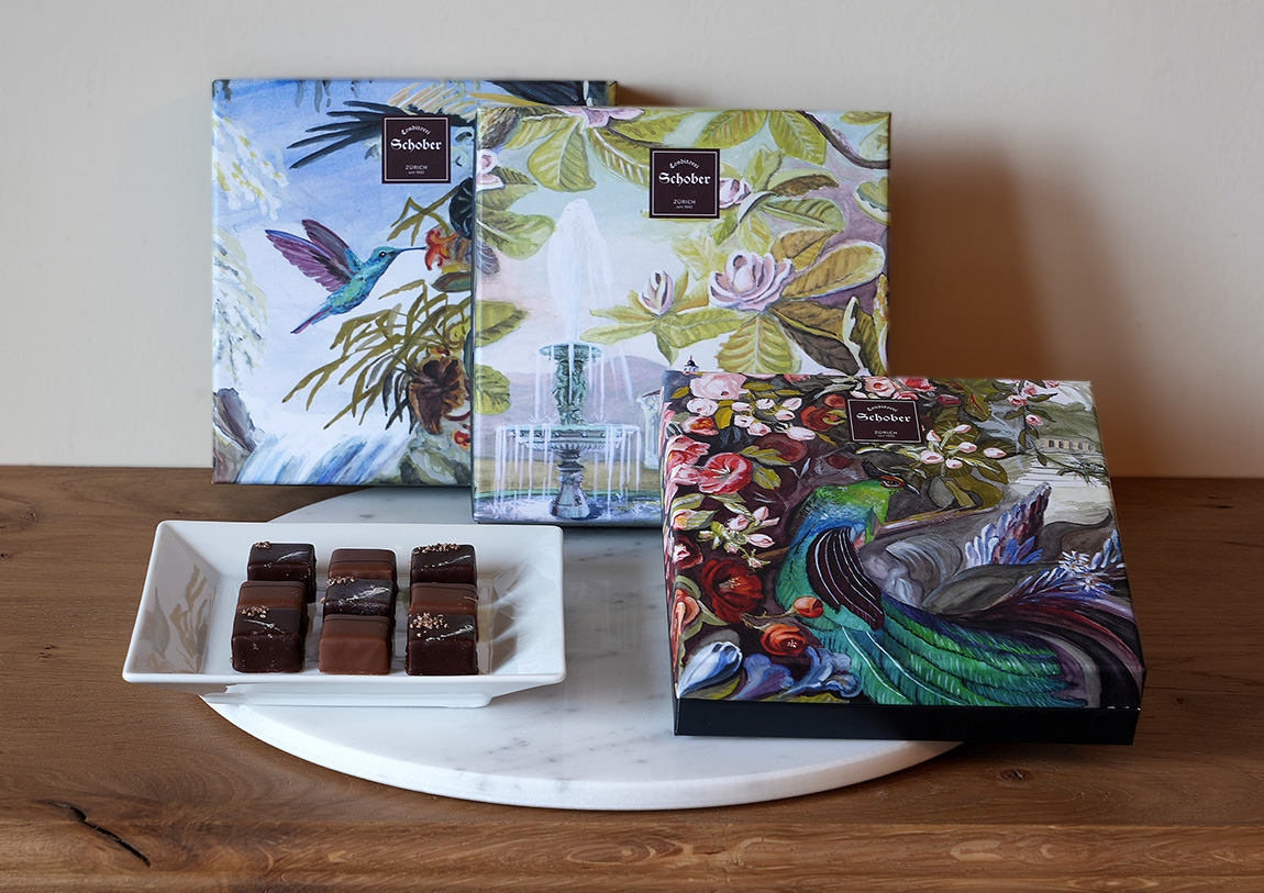 Die Pralinés, die in der Schober-Auslage liegen, wirken zudem wie kleine Kunstwerke – und das nicht nur wegen ihrer erlesenen Zutaten. „Herausragende Pralinen brauchen auch eine entsprechend einmalige Verpackung“, sagt Roland Guggisberg-Eich. „Für drei Praliné-Sélections haben wir Schachteln gestaltet. Barbara macht als Designerin Layout und Grafik. Ich habe mit Gouage-Farben die Vorlage für das Cover gemalt.“