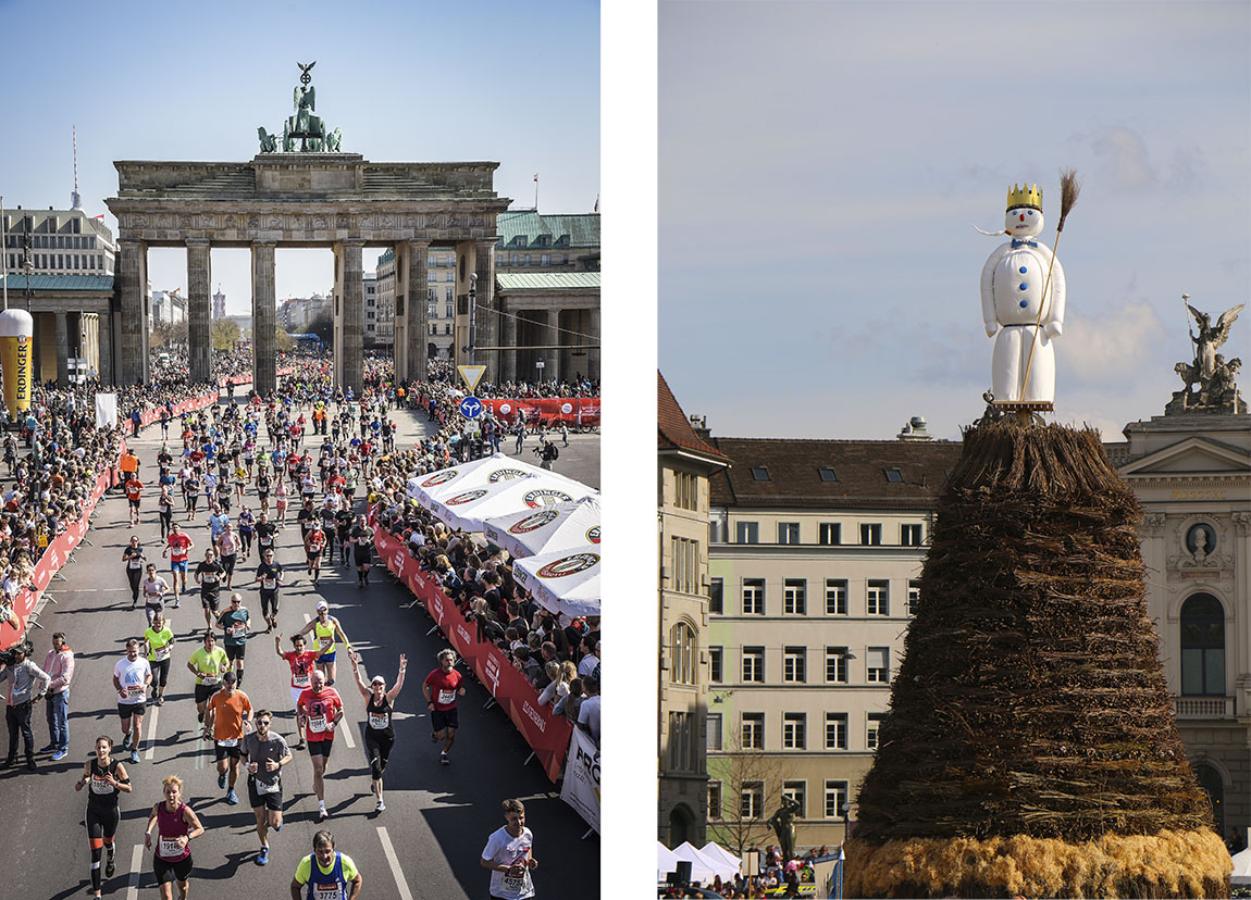 Left: Generali Berliner Halbmarathon 2019 Photo: SCC EVENTS/ Sportografen. Right: Traditional burning of the Böögg in Zurich Photo: Pixabay