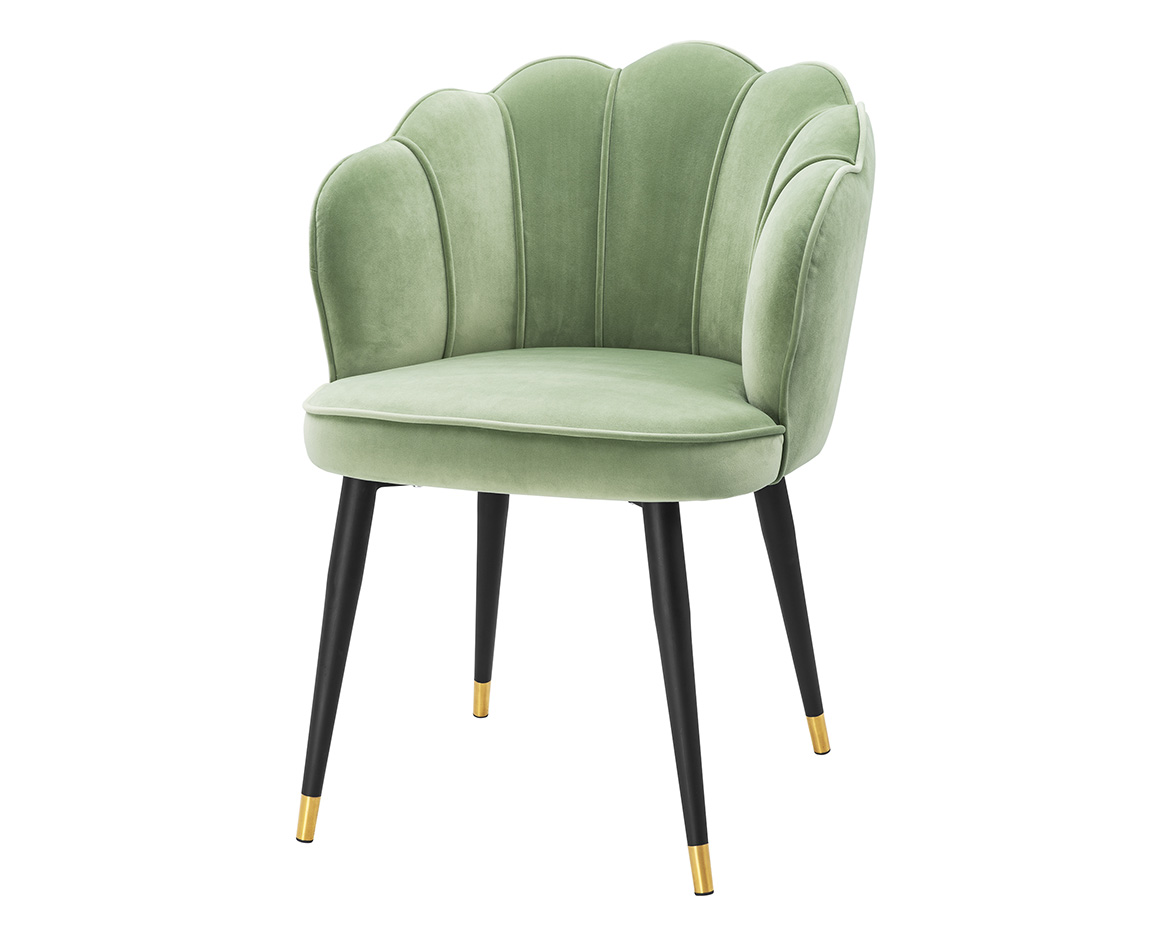 Revive your dining area with this lavish clamshell-shaped dining chair! Stylish, elegant and inspired by early-century extravagance, this chair is upholstered in an utterly mesmerising green tone and features gold-capped tapered legs. £540.