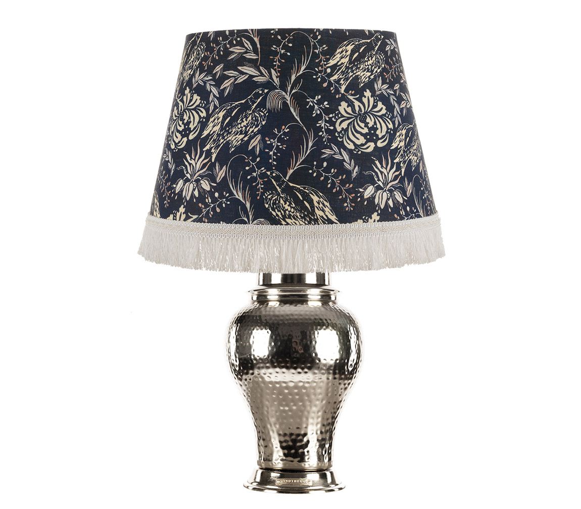 Noble blue of Hungarian roots blends together with elegant white floral stencil pattern in this stylish linen cone shade. Finished with white fringes and golden metallic lining. £599.