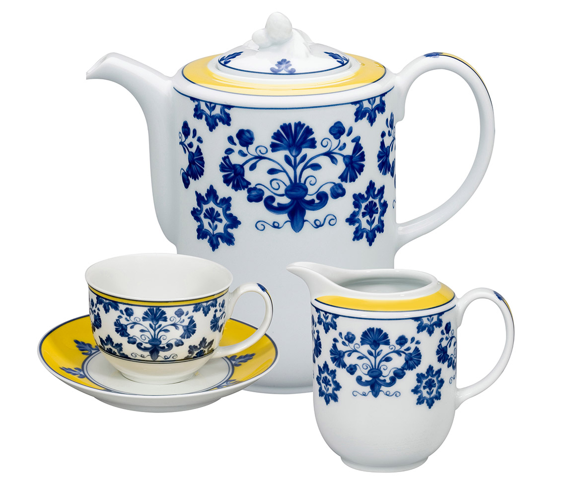 Hand-crafted and hand-painted porcelain 15-piece coffee set from the Castelo Branco Collection of the Portuguese manufacturer Vista Alegre. This luxurious set is inspired by the famous embroidery of Castelo Branco.