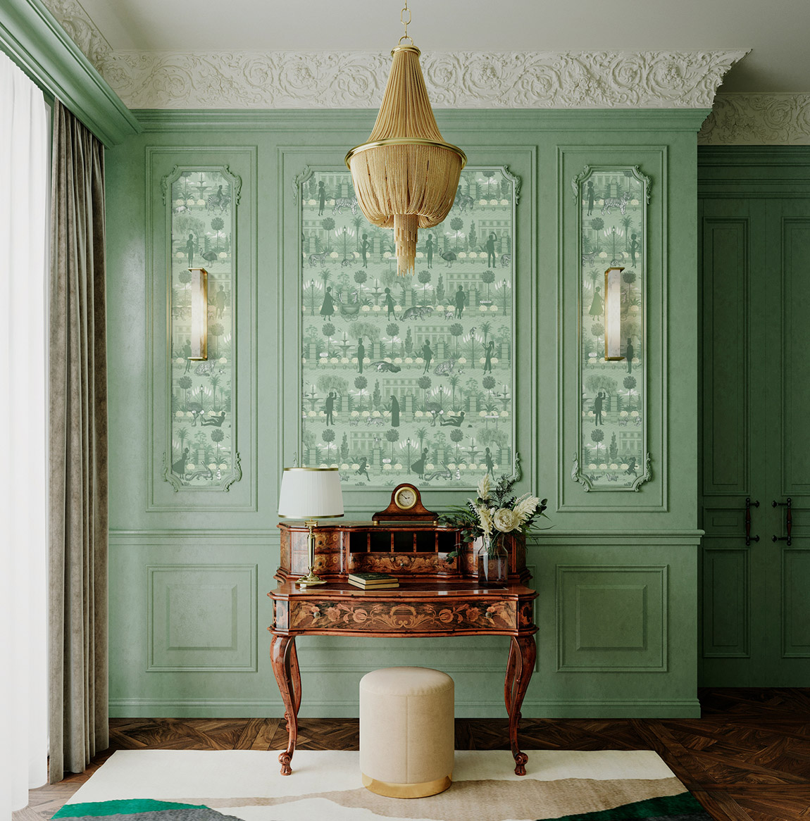 Inspired by London’s most unusual pets, this detail-rich wallpaper revisits a bonkers, bygone era where you could encounter an array of exotic animals not just at the zoo, but on the streets.