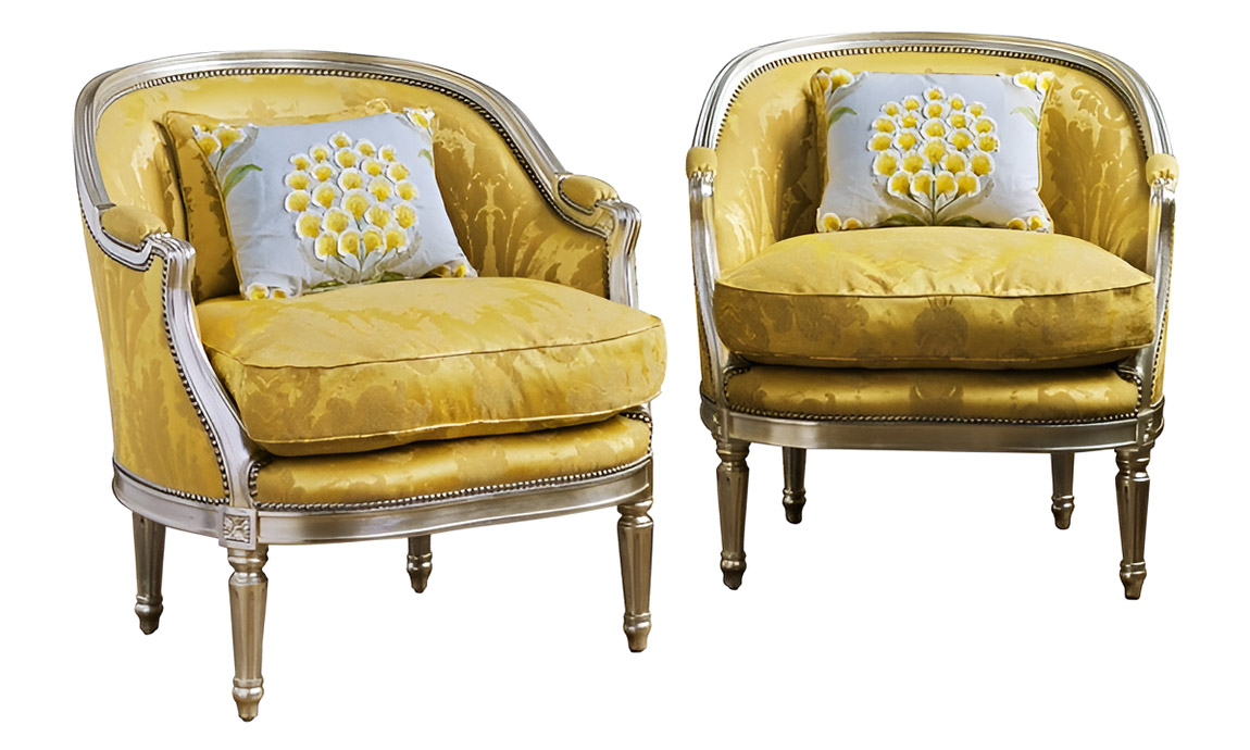 A pair of Hollywood Regency-style marquise armchairs featuring elegant curves and a glamorous silver gilt wood finish. The chairs have a plump feather seat cushion for comfort and are upholstered in an Italian fabric.