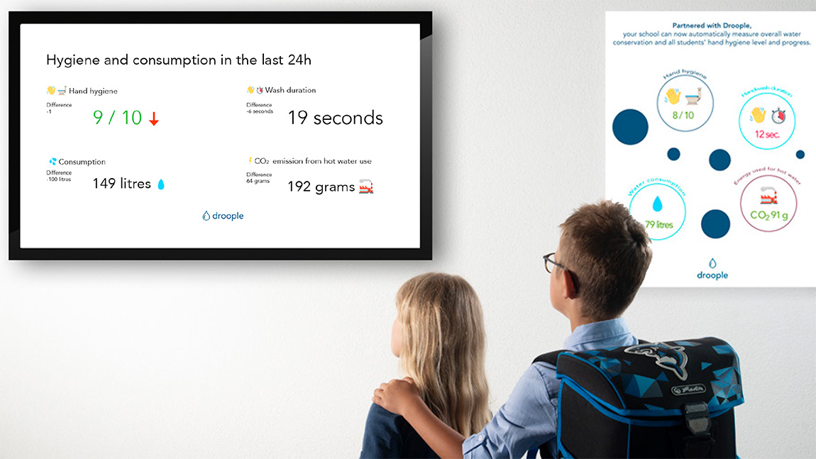 Typically, Droople will monitor water dispensers for better maintenance. The data can also be used to pinpoint water stagnation at specific points of use such as sinks or showers in hospitals, schools or hotels, assess hand hygiene habits of students in schools or detect water leaks from ghost flushes in toilets.