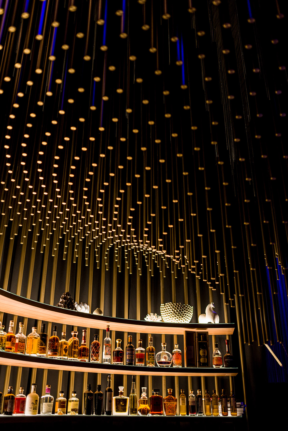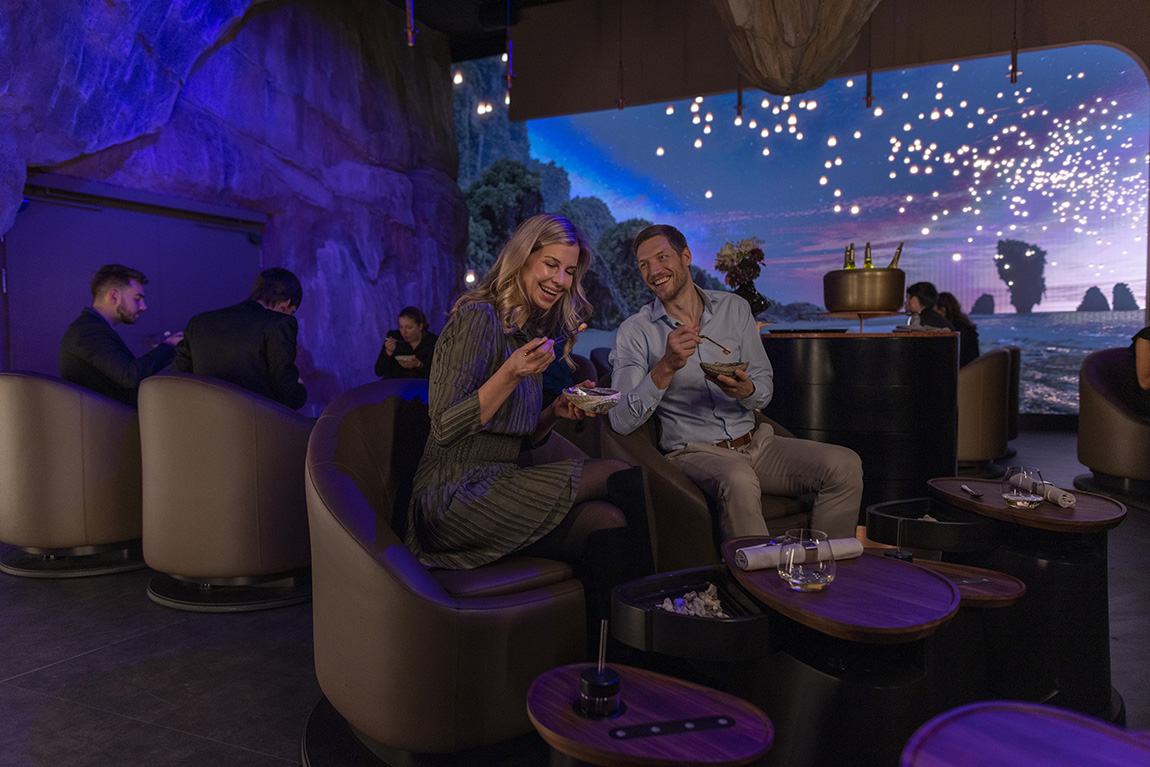 In der Praxis reisen die Gäste während des über zweistündigen Programms durch elf verschiedene Genusswelten. Unterschiedliche, thematisch hochwertig designte Räume, die mit visuellen, akustischen, olfaktorischen, gustatorischen und haptischen Elementen angereichert werden, ziehen die Besucher:innen in ihren sinnlichen Bann. Jede Reise beginnt in der Lounge, wo das freundliche Team des Restaurants die Gäste mit einem Glas Laurent-Perrier Champagner empfängt. Auf Floating Chairs bewegen sich die Gourmets nun in die unterschiedlichen Räume und erleben eine ganz besondere Reise. Ob in die Tiefen des Meeres, nach Asien oder auf den Mond – es gibt viele Möglichkeiten. „Jede Experience endet wieder auf der Erde”, ergänzt Mack. „Und zwar in unserer Bar, wo man das gerade Erlebte noch einmal in Ruhe Revue passieren lassen kann.”