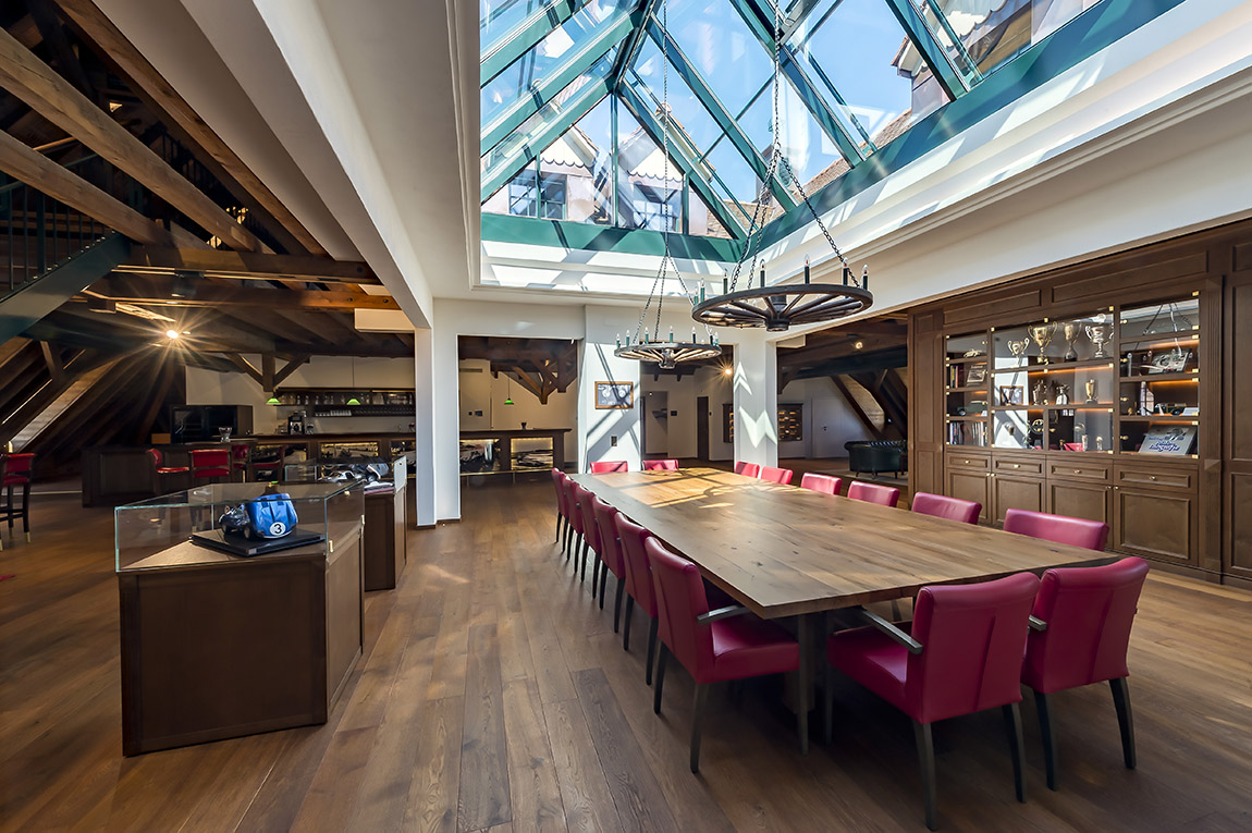 For a company anniversary, trade fair, wedding or product launch, two exclusive spaces are available to hire. The Event Hall impresses with cutting-edge technology, industrial flair and a flexible layout that adapts to suit every client’s vision. Upstairs, the Club Room offers an air of refined comfort and intimacy, complete with bar, fireplace, smokers’ lounge, gallery and terrace. From here, guests can take in sweeping views of the glass-walled classic car exhibition – an experience guaranteed to give even the most seasoned technophile goosebumps.