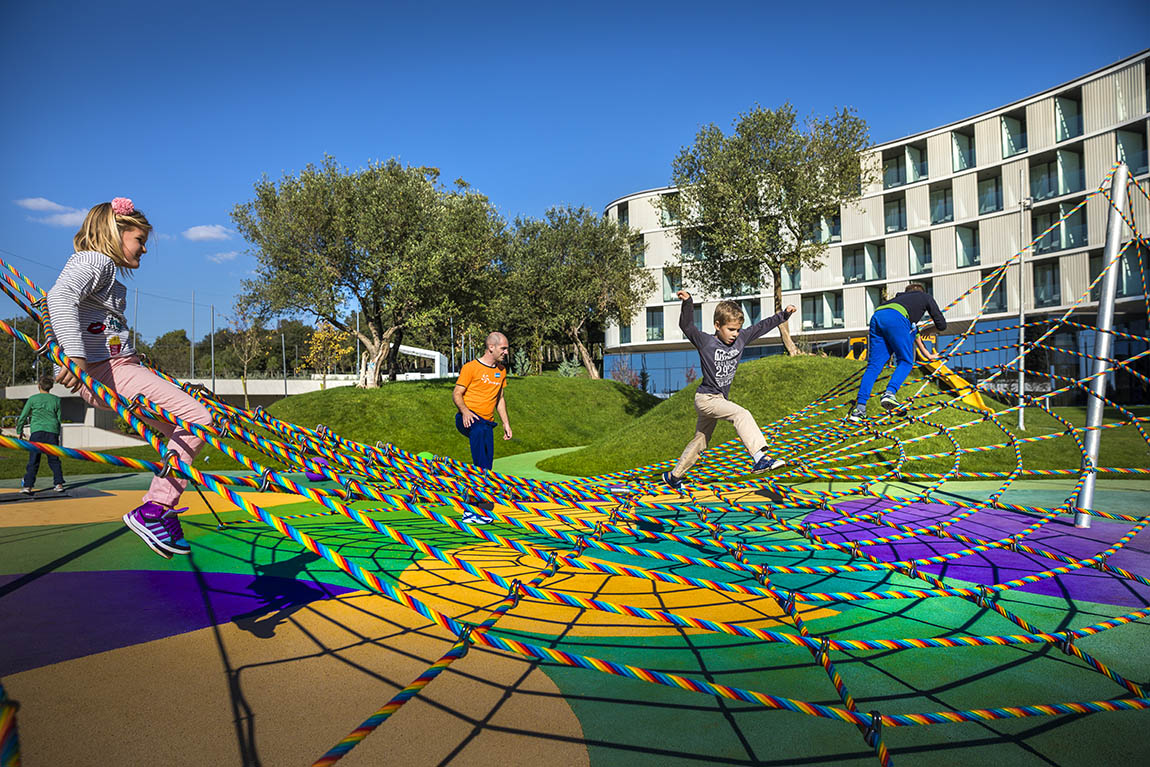 Situated at the end of the Rovinj seaside promenade, the Family Hotel Amarin is sheltered under pine trees on a green peninsula and most of the rooms have a magnificent view over either the old city of Rovinj or the sea. The Croatian Studio Up originally designed the hotel with 280 elegant rooms and suites over four floors. The double beds have a clever design that allows guests to pull out a child’s bed at each side in the evening and store it away when it is not used during the day. Children and families were the focus right from the beginning, after all: normally, check-ins can be very boring for kids, but at Hotel Amarin, children are greeted with the so-called blu net installation, where they can jump about after being stuck in a car or plane for hours. While doing so, they will also get a first glance at the indoors and the garden pool.