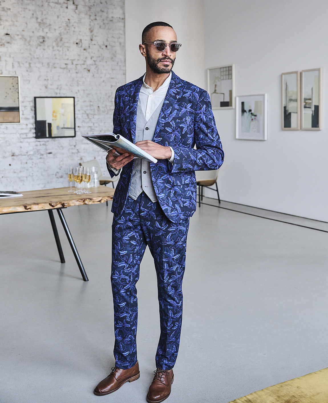 This modern suit in vibrant blue with a fashionably daring floral pattern gives a feeling of adventure and a jungle atmosphere. The dynamic cut and clever workmanship allow unrestricted freedom of movement, while the suit remains wrinkle-free even after meetings. £POA.