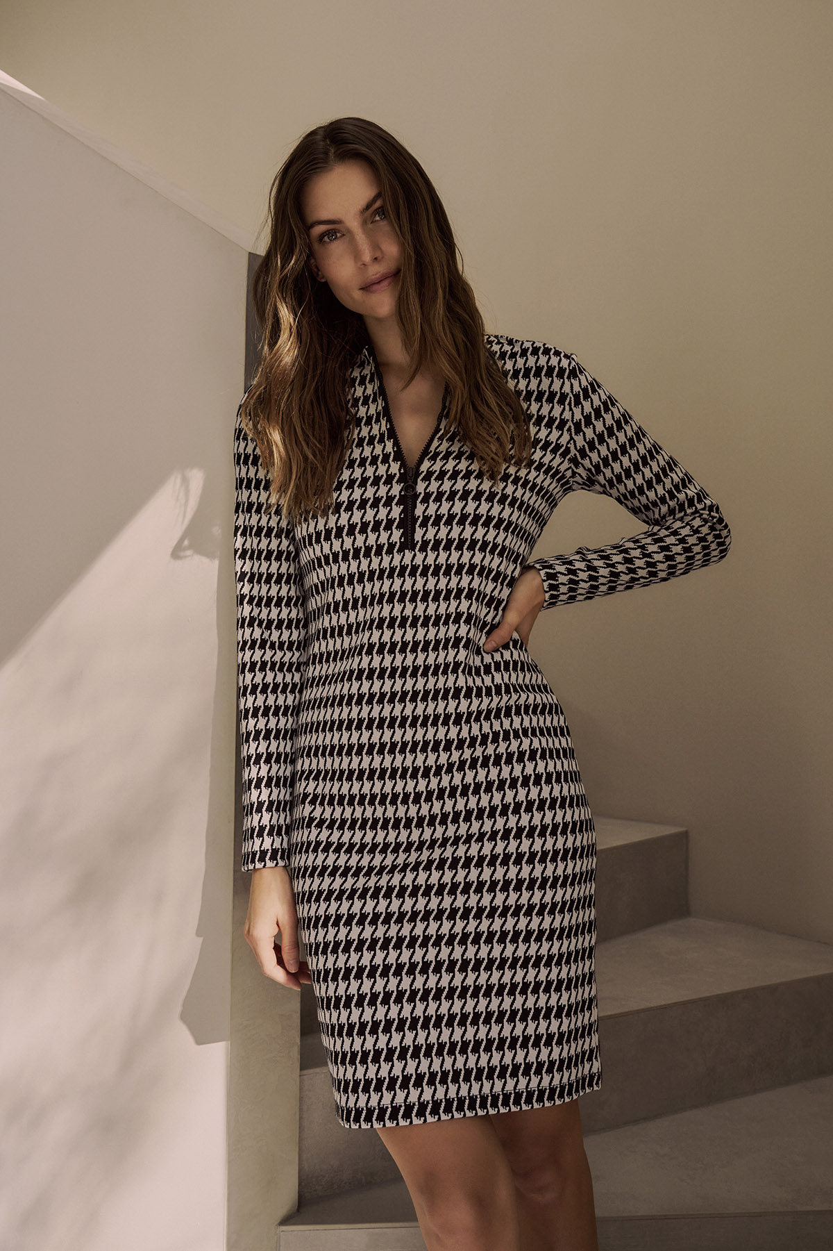 Great for work or an evening with friends – this long-sleeved dress with a houndstooth pattern is made from soft jacquard jersey. The knitted collar with contrasting zipper adds a modern accent, while the slim fit ensures a stylish look. £169.