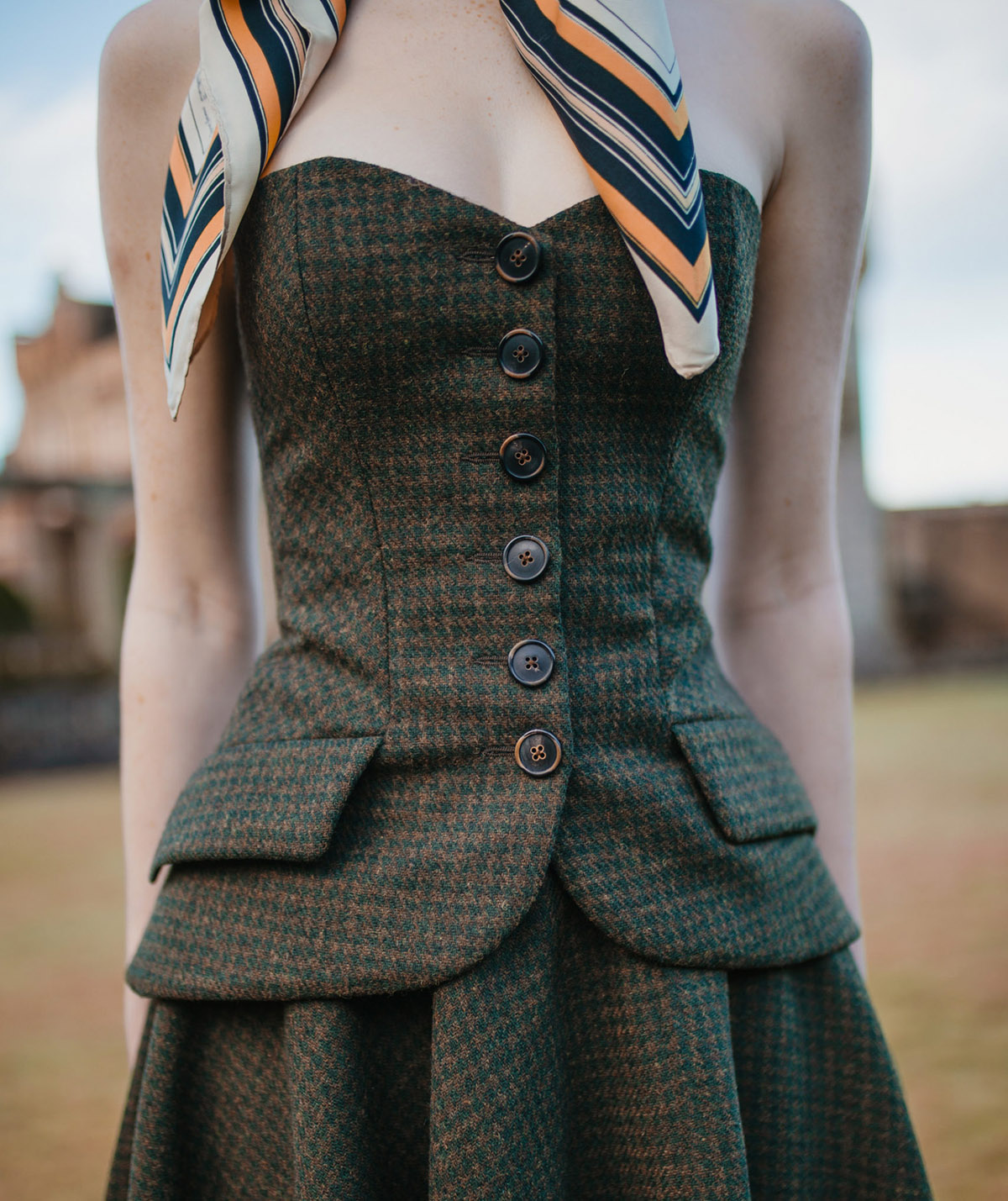 The ‘Queen Mary’ strapless bustier top is finely tailored from checked wool into a flattering bustier silhouette. Here, it is stunningly combined with the ‘Heritage’ skirt made from tweed. Bustier £328, skirt £450.