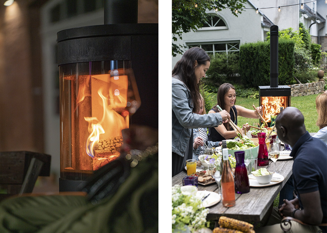 Aber warum überhaupt Outdoor Kamine? „Mit Outdoor Kaminen von FIRETIME® können unsere Kund:innen ihr Zuhause ins Freie verlagern und ihren geschützten Lebensraum erweitern”, erklärt Rovito. „Ursprüngliches Feuer übt eine besondere Faszination aus. Den tanzenden Flammen zuzusehen, hat fast etwas Meditatives. Feuer hat aber auch eine soziale Komponente als Treffpunkt, als Ort zum Feiern, Plaudern und Genießen. Allerdings hat offenes Feuer einen entscheidenden Nachteil…” „Ja, Geruch und Funkenflug”, lacht Harikantha. „Die Klamotten können direkt in die Wäsche und nicht selten findet man kleine Brandlöcher in der Lieblingsjacke“, ergänzt Rovito.