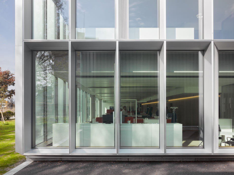 the façade of the visually impressive Tesla data centre by the Birs river, which reflects the hues of its immediate surroundings with brightly gleaming, high-reflective effects. Here, clients from the IT sector can rent spaces on three floors with ideal, safe conditions for their servers. With regard to possible high water levels of the nearby river, the building features no basement. Realised through a massive steel and concrete structure, the external walls are made of sandwich elements and feature a ventilated chrome-nickel steel façade. The building was recently awarded with the ‘Marketing und Architektur’ gold medal.