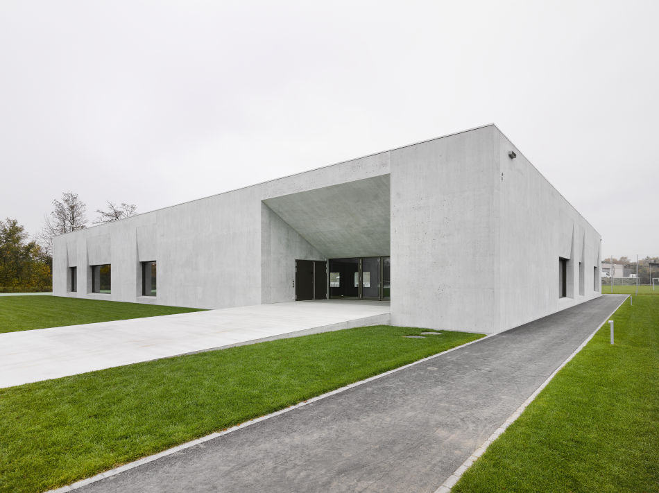 The Oensingen multipurpose sports hall is oriented on the existing access axis of the school complex. The partially entrenched building volume features a ground-level entrance which, on entering the building, offers a wide view of the pitch. The exposed concrete building is marked by both the reduced choice of material and the clear, streamlined layout. The rhythm of open and closed spaces within the structure and façade grants a range of interesting views and perspectives.