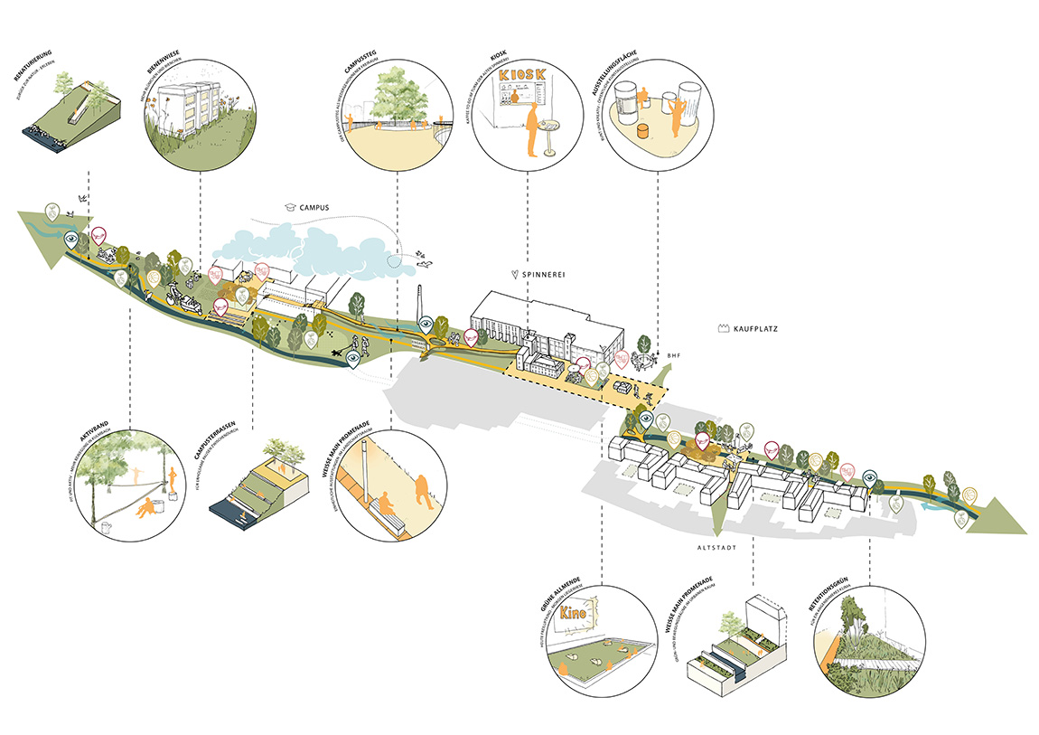 Another example of successful urban planning is the transformation of the Margrave city of Kulmbach. This initiative envisions three urban centres: a green residential area (Kaufplatz), a creative and educational(Spinnerei) and a learning hub (Campus). These areas will be interconnected by a green corridor offering climate-resilient spaces for relaxation and activity.