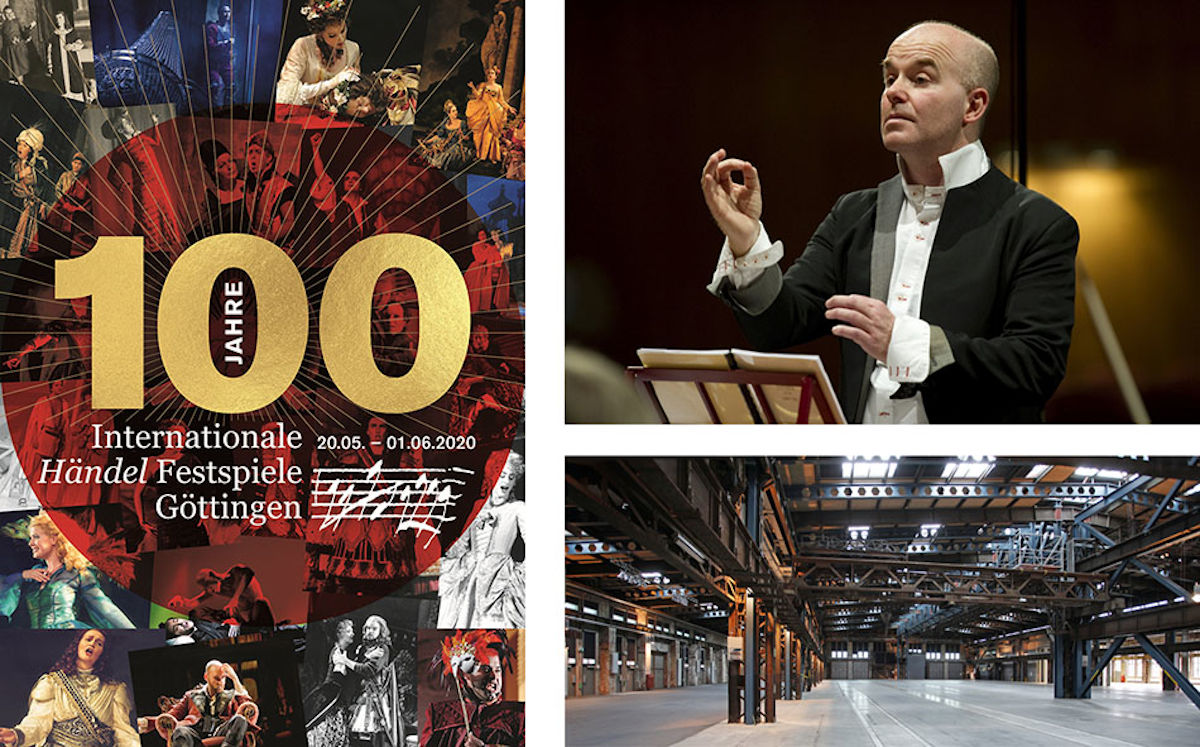 Left: The motive of the 2020 Festival looks back at 100 years variety of staging. Photo: © Heinrich Kreyenberg. Top right: The current Artistic Director Laurence Cummings. Photo: © Anton Säckl. Bottom right: The Lokhalle Göttingen becomes a large concert hall. Photo: © Mirko Plha