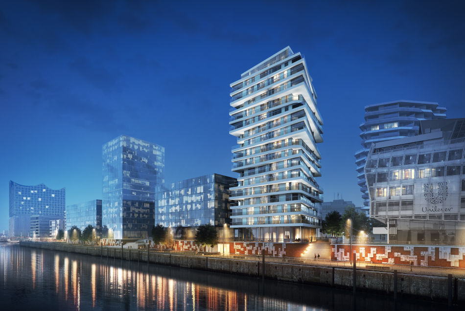 Strandkai (‘Beach Quay’) is the name for a residential quarter that is being developed on one of the most prominent sites in Hamburg’s ‘HafenCity’ port district. Embedded into the elevated land area, four residential buildings, two seven-storey structures and two residential high-rises will decisively mark the cityscape to the south. The design is based on a layered arrangement of floor levels with surrounding balconies. The corner-points of the stacked penthouses create a dynamic rhythm for the structure, forming a new landmark at the highly visible location. Spacious loggias will offer far-reaching views across the Elbe river and the city itself, as well as towards the new Elbphilharmonie complex.