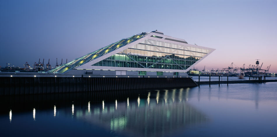 The Dockland building, constructed between 1998-2006, forms one of the most renowned Hamburg landmarks by the Elbe river, together with the ‘Elbphilharmonie’ (Herzog & de Meuron) and the ‘Empire Riverside Hotel’ by David Chipperfield. The “figurehead for online captains” offers roughly 9,000 square metres of office space. With the ‘bow’ of this ship-like steel structure jutting out freely over 40 metres, the glassed-in façade allows employees to enjoy the view of the port panorama directly from their offices, while visitors can get to the terrace via a public outdoor staircase.