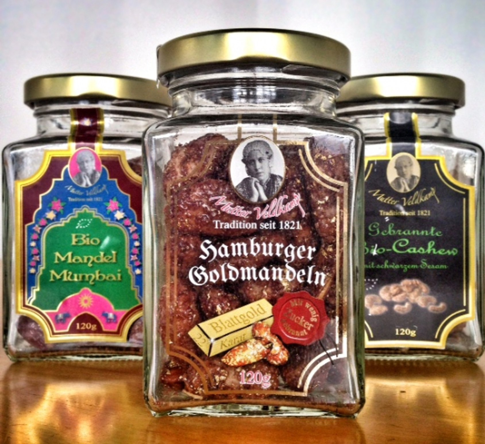 Today, her portrait adorns the glass of Hamburger Gold Almonds created by her descendent Tom Veldkamp. “In memory of Mother Veldkamp, we toss the almonds in 22-carat gold leaf,” he explains.