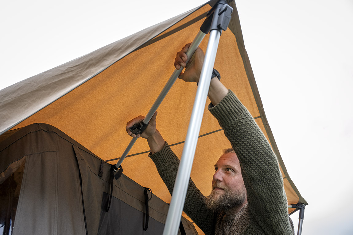 Das einzigartige, patentierte Teleskopstangen-Spannsystem des Hapro Vista verleiht dem Zelt nicht nun seinen ikonischen Look, es sorgt auch für ultimative Windbeständigkeit und Stabilität zu allen Jahreszeiten und in jeder Wetterlage. Zudem lässt es sich leicht, schnell und straff spannen, so dass es selbst bei starkem Sturm nicht flattert. Das hochwertige De Waard-Zelttuch aus 235 Gramm Baumwolle ist extrem strapazierfähig, sowie feuchtigkeits- und temperaturregulierend. Die bequeme Matratze mit Öko-Tex Standard 100 zeichnet sich derweil durch einen angenehmen statischen Druck und eine ebenfalls hohe Feuchtigkeitsregulierung aus. Und nicht zuletzt wird das Dachzelt komplett in den Niederlanden hergestellt: Die Bestandteile stammen dabei so weit wie möglich aus der EU, was zu einer insgesamt geringeren CO2-Bilanz führt. Das Hapro Vista ist somit ein Zelt aus sicheren Materialien, unter fairen Arbeitsbedingungen hergestellt.