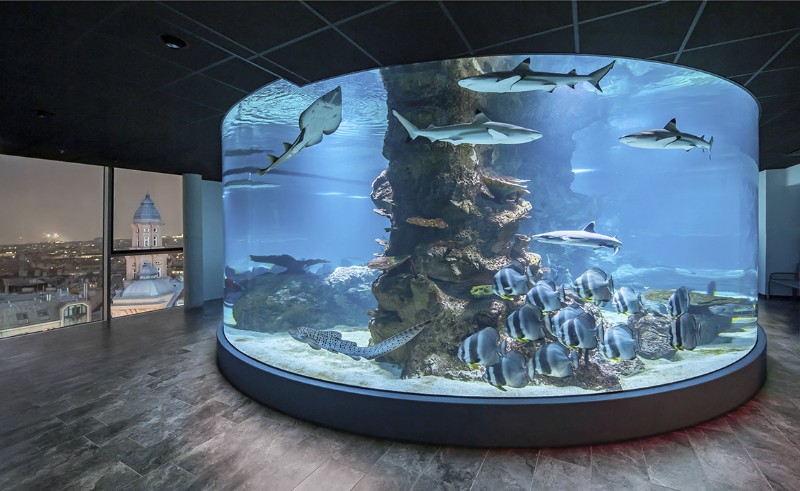Ein absolutes Highlight ist das 360-Grad Haifischbecken auf knapp 120 Quadratmetern im siebten Stock. Die Publikumslieblinge sind hier die zwei Haifischarten, Weissspitzen- und Schwarzspitzenriffhai, die sich das Habitat mit verwandten Rochenarten teilen.