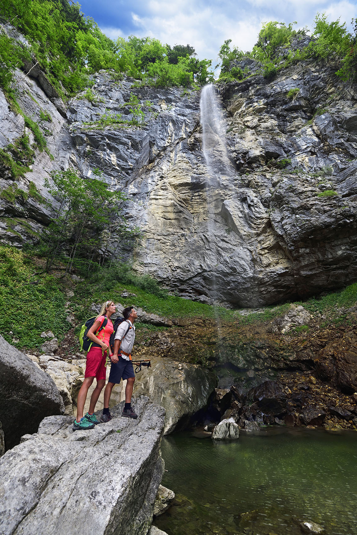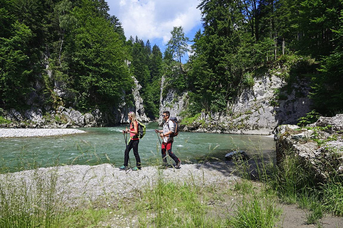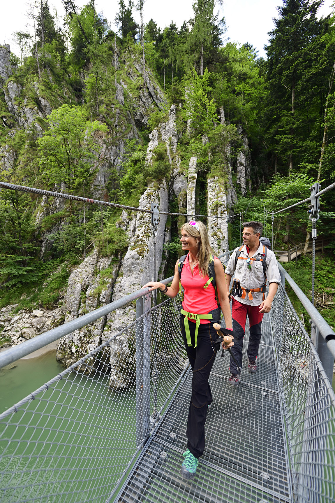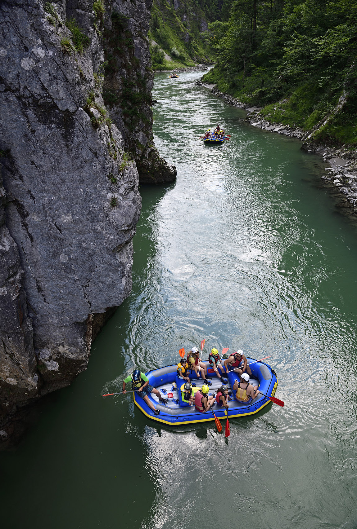 Down by the Ache, the striking ‘Duck Hole’ immediately catches the eye. Here, Tiroler Ache, along with numerous kayakers and rafting boats, squeezes through monumental cliffs. It picks up speed again in a wild 90-degree bend. An adventurous hike first leads across a heart-pumping, wobbly suspension bridge to the opposite bank. Here, too, both riverbanks are flanked by massive rock pillars that immediately remind us of the blockbuster The Lord of the Rings. The tour continues to the 1,430-metre-high Rudersburg Castle.