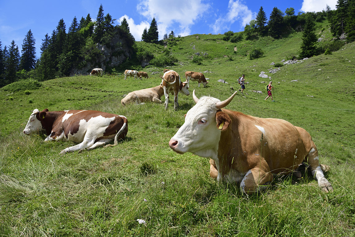 Dewdrops glisten in the grass. Birdsong echoes from the towering firs. Fluffy clouds drift across the treetops. The hiking trail gently climbs from Schleching to Oberauerbrunst-Alm. After a good hour, we reach the tiny, picture-perfect hut, which is only open on weekends. We are the only guests. We enjoy the fresh butter, the mild alpine cheese, and the spicy venison salami made on the farm, which the dairymaid serves us like a still life on a wooden plate. We enjoy the panoramic view of the hills of the Chiemgau Alps and the view down to Schleching. The tinkling of the cowbells puts us into a kind of meditation.