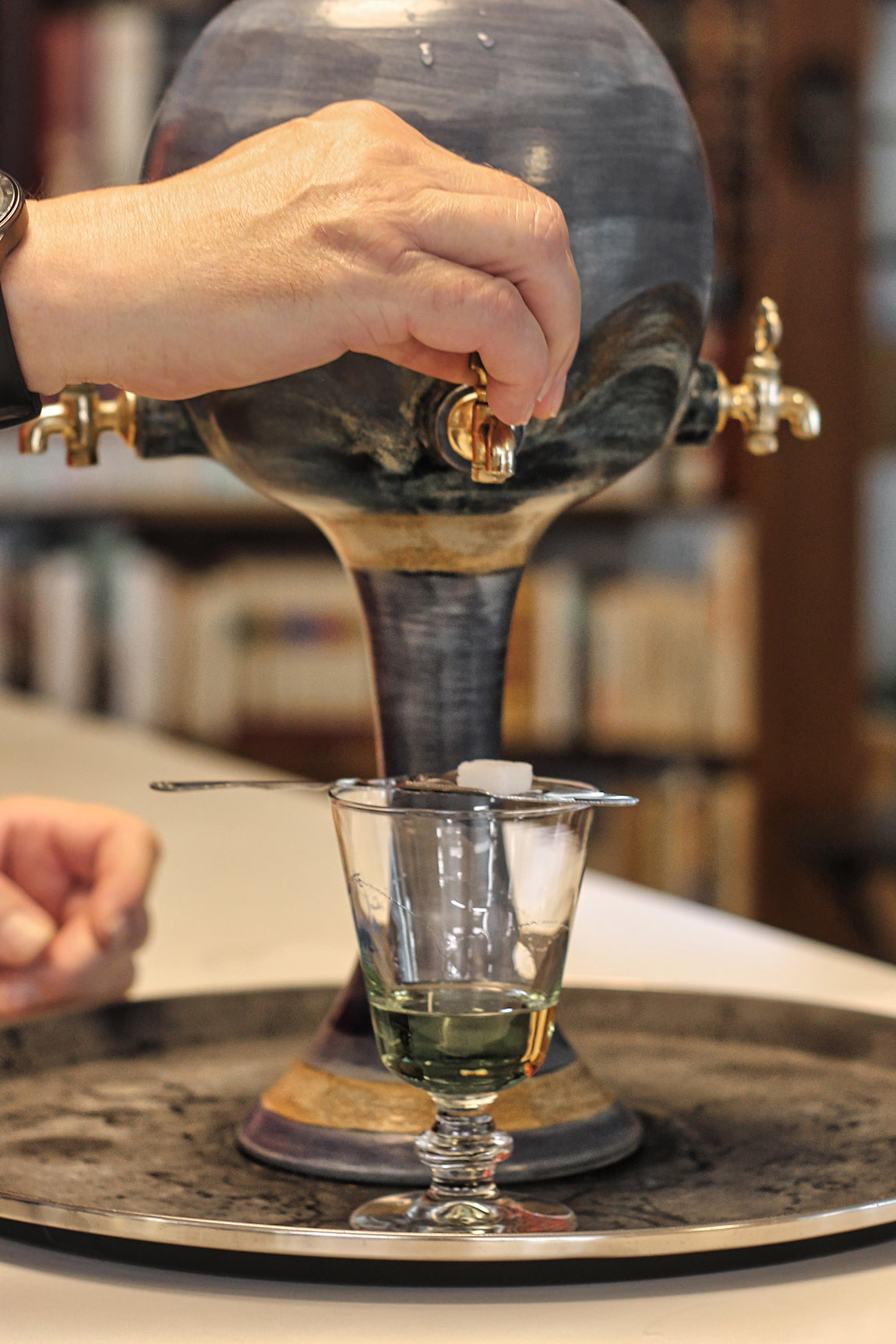 “You can also use the spoon and the sugar,” he says, referencing the customary stainless steel spoon you use when pouring water from the fountain. As per tradition, the perforated spoon is placed with a cube of sugar on top of the absinthe glass, as water slowly drips from the fountain, melting the sugar into the drink below. “It gives you a sweet nose, and helps it give off the aroma, removing the bitterness of green absinthe.”