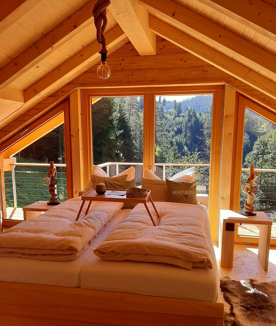 Ein besonderes Highlight ist das auf Rollen befestigte Himmelbett, in dem man eine unvergessliche Nacht unter den Sternen verbringen kann. Die Panorama-Fasssauna und der Focuskamin – sie garantieren ein unvergessliches Urlaubserlebnis. Eine Fußbodenheizung, die vollausgestattete Küche mit Raclettegrill und das moderne Bad runden den perfekten Urlaub ab. Und das zu jeder Jahreszeit.