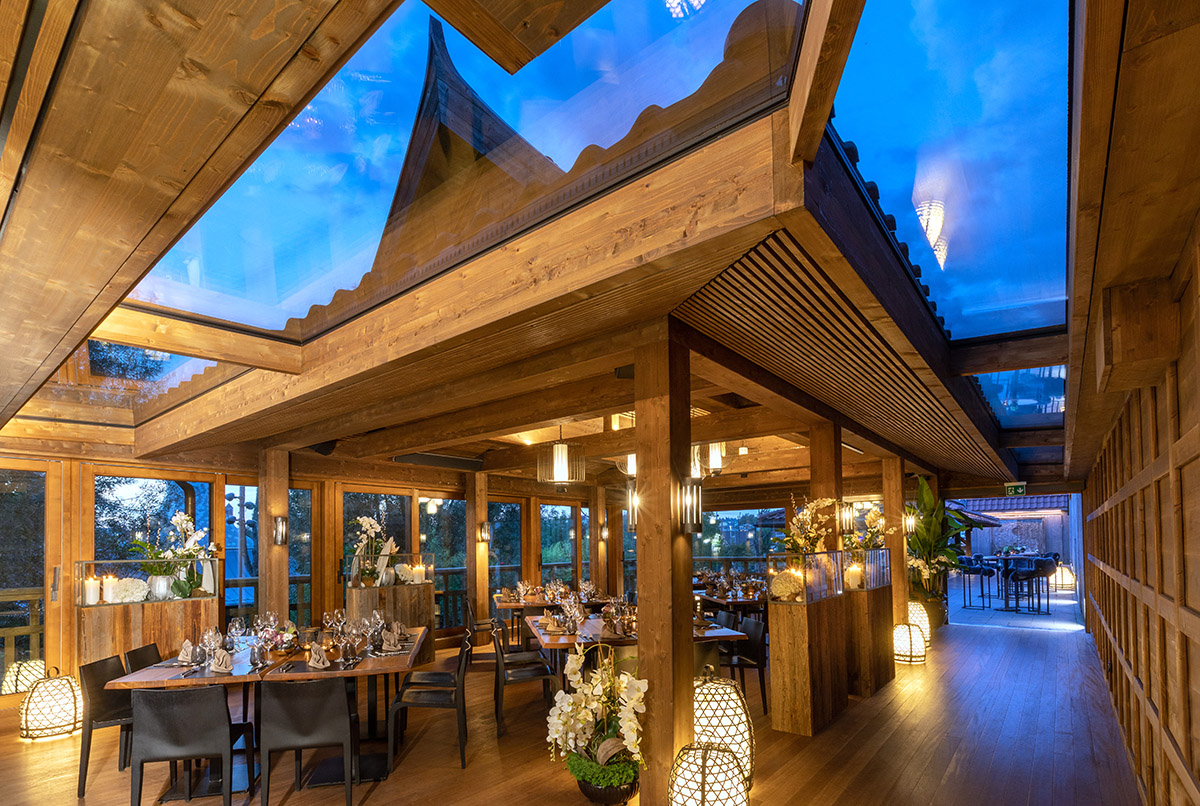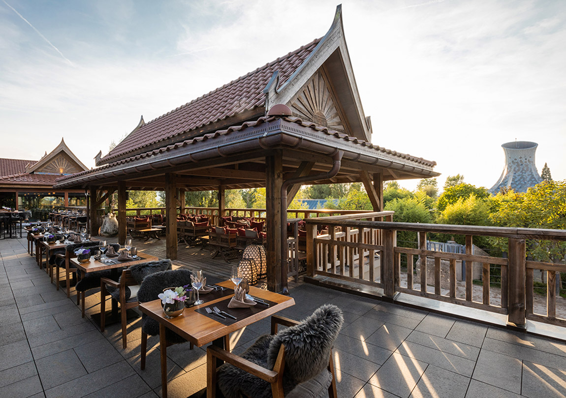 The main restaurant boasts a spacious waterfront terrace, while Kinaree Lodge, a stylish Thai conservatory, is perfect for smaller groups. A real highlight is the Thisiam Lounge, perched high above the adjacent elephant enclosure. “From here, guests have a spectacular view of these gentle giants,” says Franco Knie. “Enjoying an apéro up here is an unforgettable experience.”