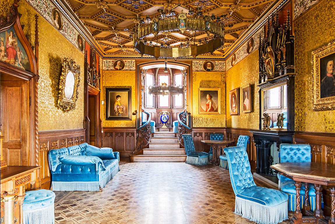 Der Blaue Salon – mit seinen blattvergoldeten Wänden und dem königsblauen Mobiliar einer der schönsten Gemächer der Burg.