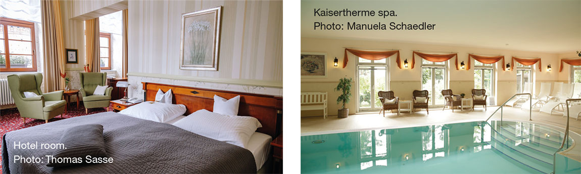 Auf der Burg selbst kann man wunderbar in der großzügigen Gartenanlage verweilen. Neben Haupthaus und Gartenhäusern befindet sich dort auch die Kaisertherme – der Spa-Bereich des Hotels. Hier lädt der Pool zu einer morgendlichen Erfrischung ein, die Saunen zur Entspannung am Nachmittag. Eine Reihe unterschiedlicher Massagebehandlungen – darunter Schokoladenaroma-Massage oder die Ozeanische Lava-Muschel Massage – tragen zum erstklassigen Wellnessfaktor bei.