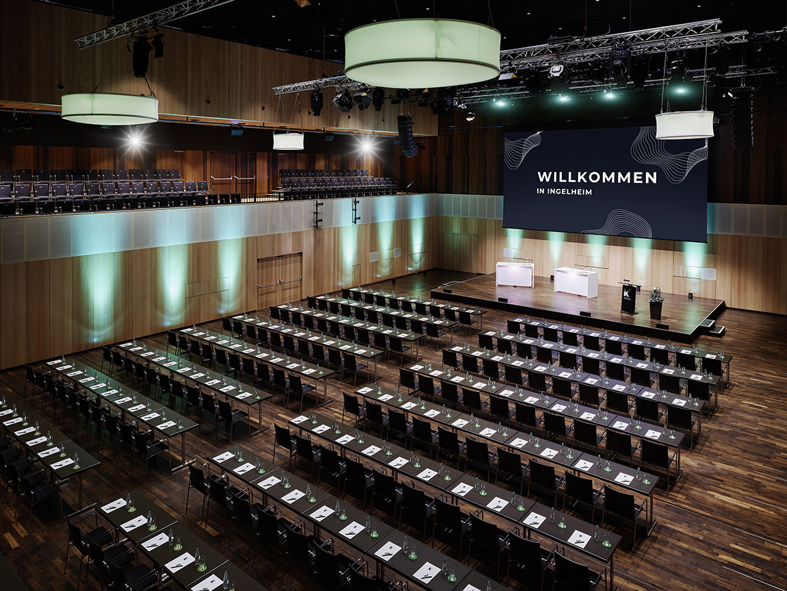 Mit ihrer geneigten Fassade und den über 300 asymmetrisch angeordneten Fenstern ist sie zweifellos ein architektonisches Statement und das ikonischste Gebäude der Rotweinstadt Ingelheim am Rhein. Die Rede ist von der kING Kultur- und Kongresshalle Ingelheim.