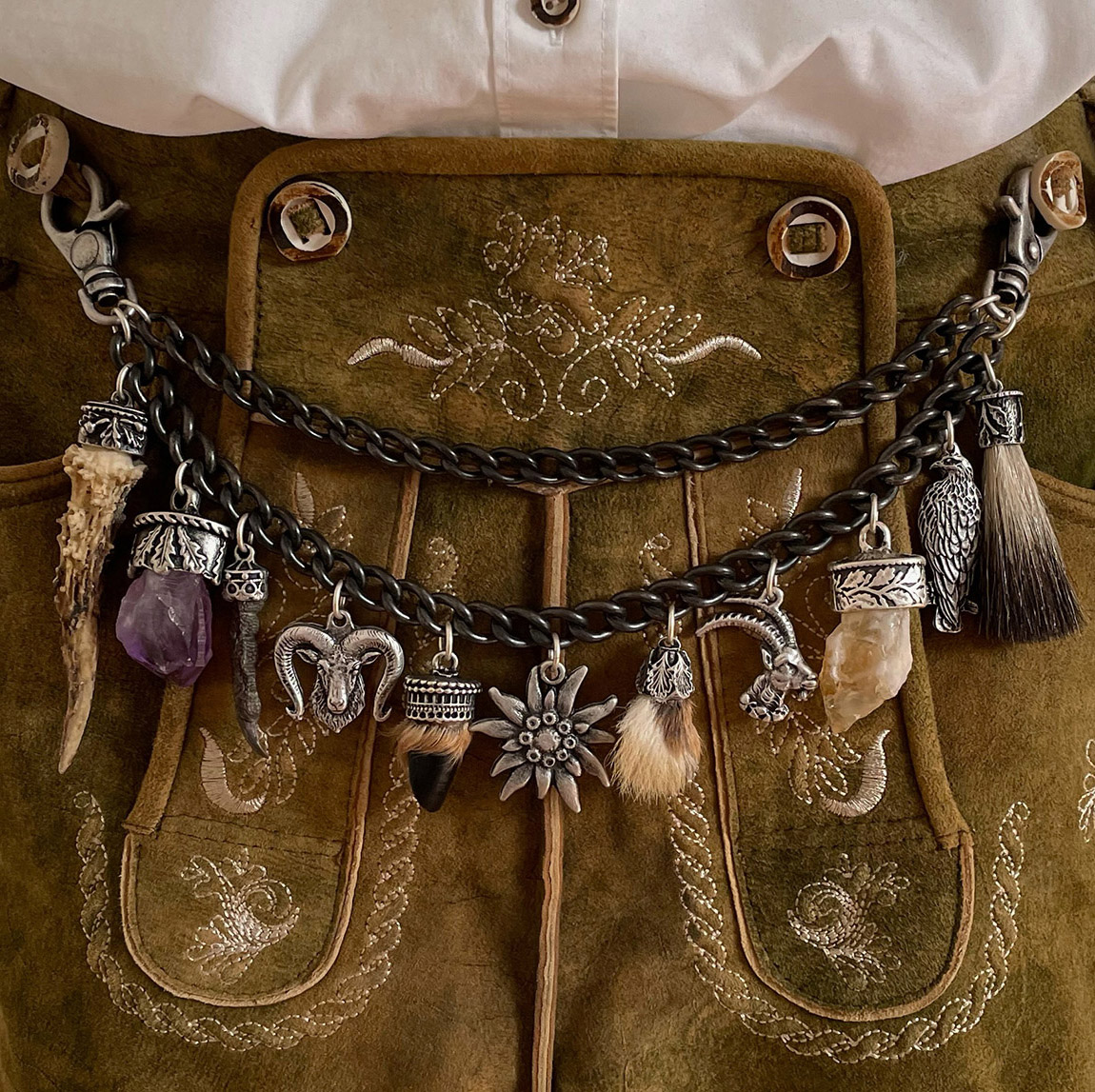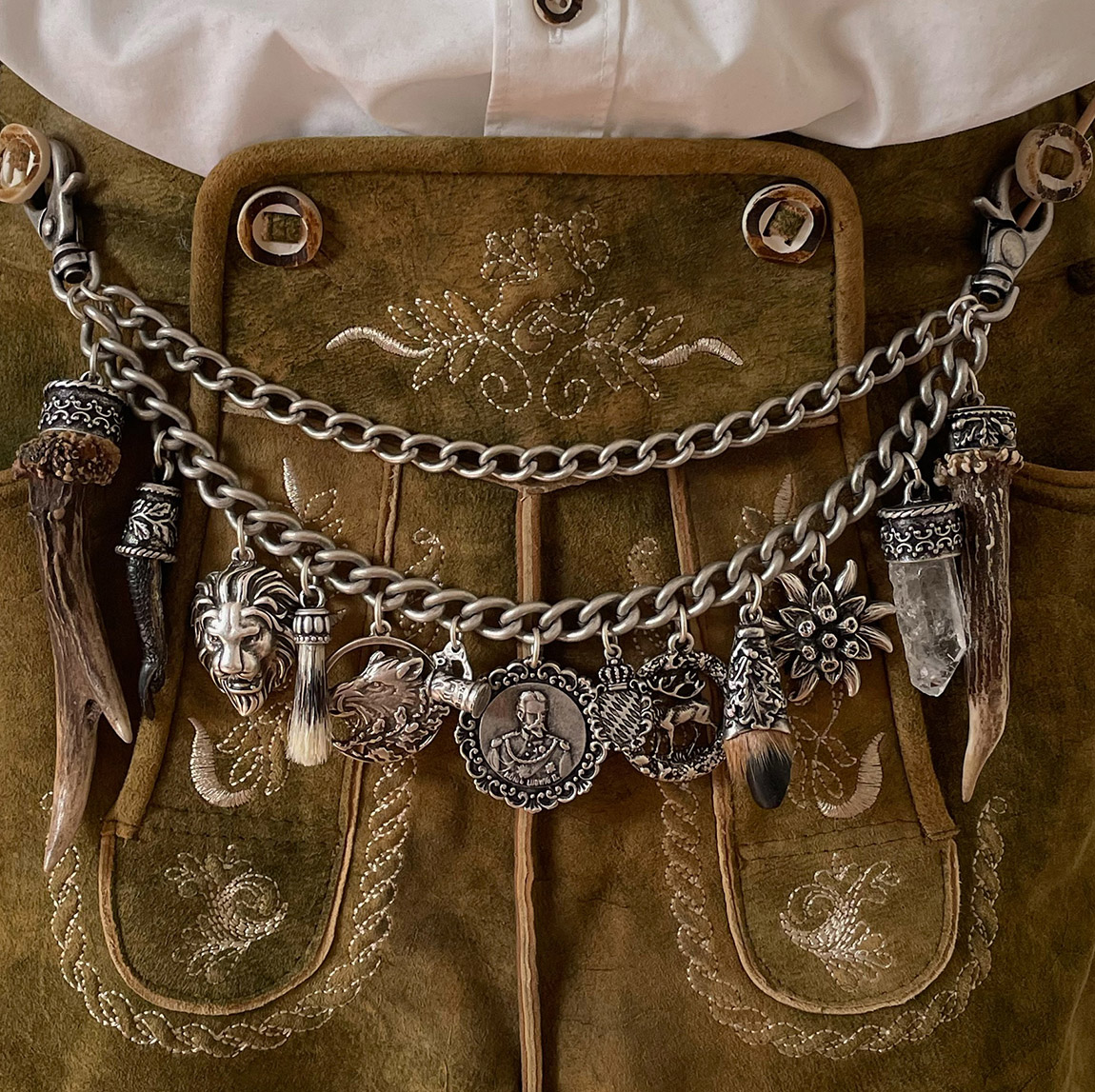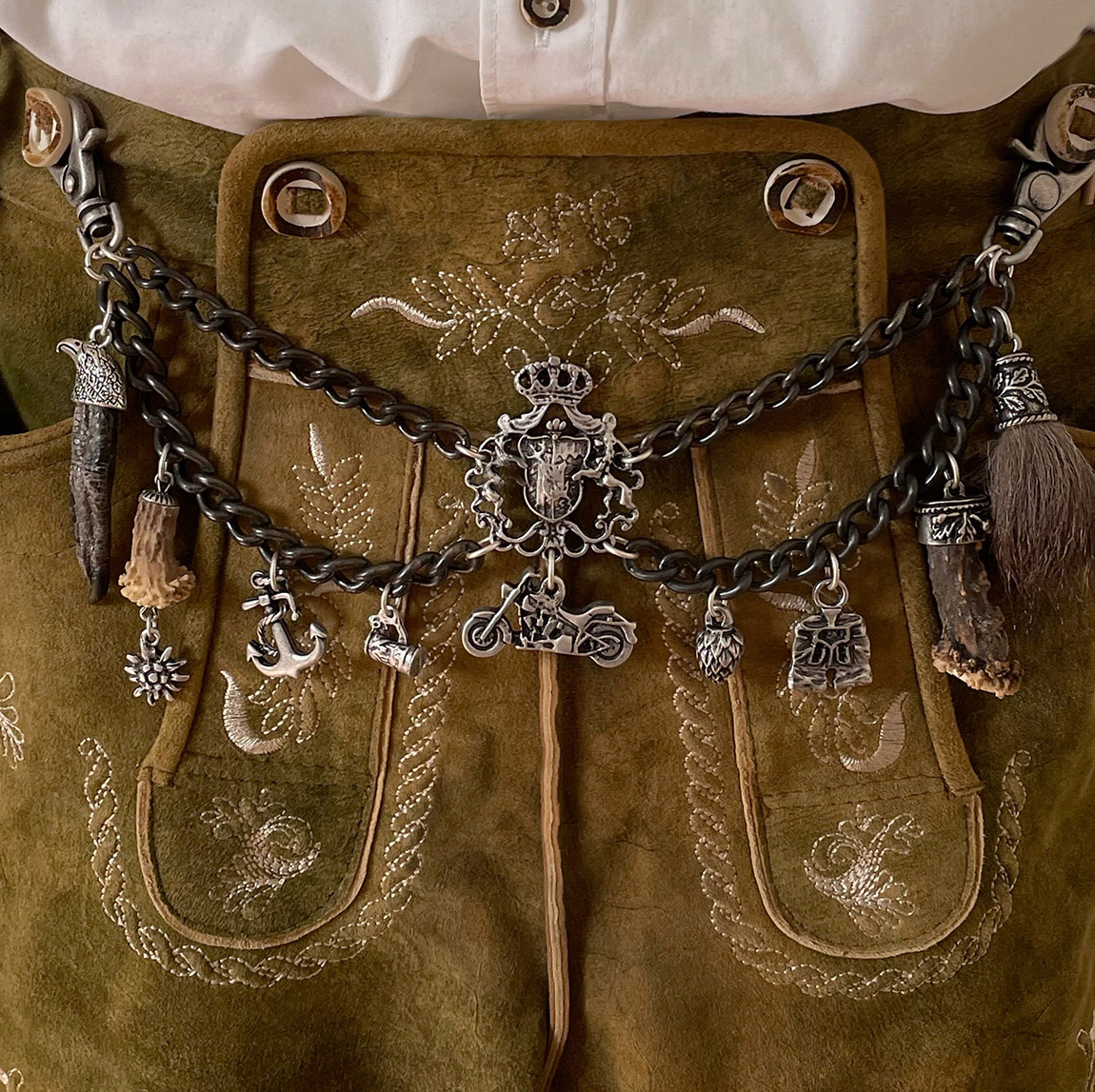 Charivari? Ja, Charivari: die raffinierten Anhängerketten für Trachtenliebhaber, die das Besondere suchen! Männer tragen Charivari lässig zur Lederhose, Frauen als Gürtel, Stecker oder als Blickfang am Dekolleté.