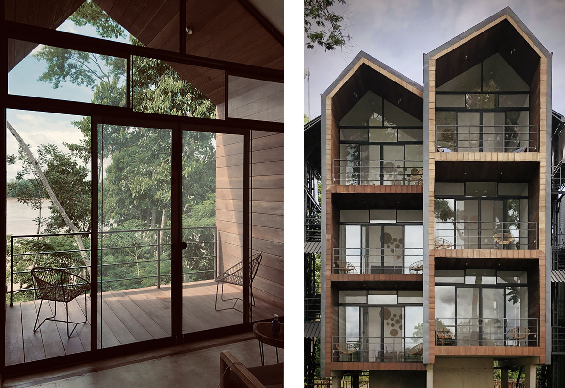 Im Kontrast zum UP! steht das am Ufer des Tambopata Flusses im gleichnamigen Naturreservat angelagerte Hotel Enaí. Inmitten des peruanischen Amazonasgebiets hat Jasper Architects eine nachhaltige, luxuriöse Oase der Ruhe abseits der Zivilisation geschaffen. Die Architektur dieser Holz- Beton Mischkonstruktion ist an die Pfahlbauten der lokalen Völker angelehnt und für die Komfortbedürfnisse eines modernen, nachhaltigen Hotels in den Tropen optimiert. Alle Räume haben Dschungel- und Flussblicke sowie viel natürliches Licht. Eine Querlüftung ist durch die längsgerichteten Zimmerlayouts gewährleistet. Durch die PfahlStaenderkonstruktion ist die gesamte Gebäudekonstruktion ständig von Luftströmen umspielt.
