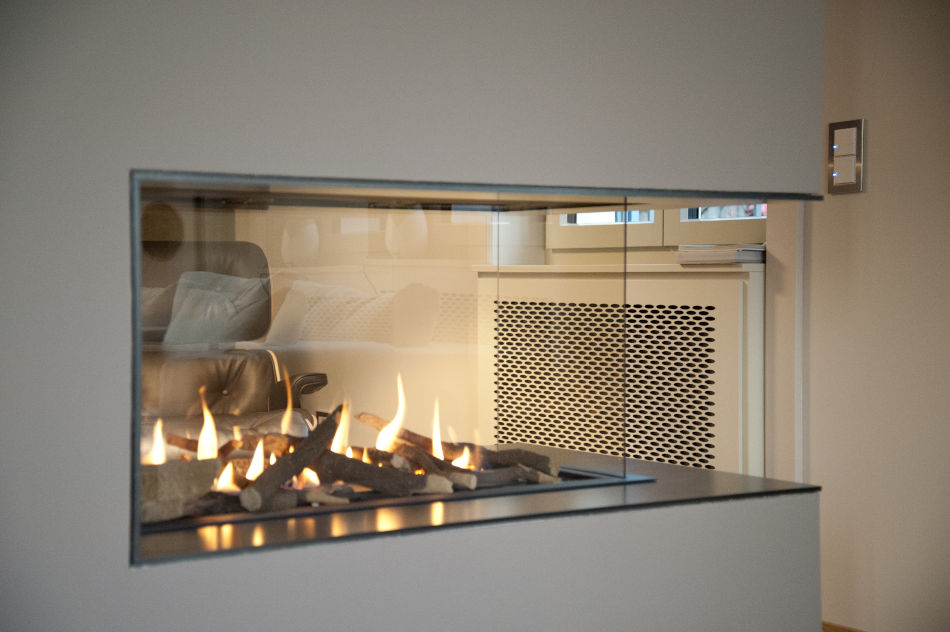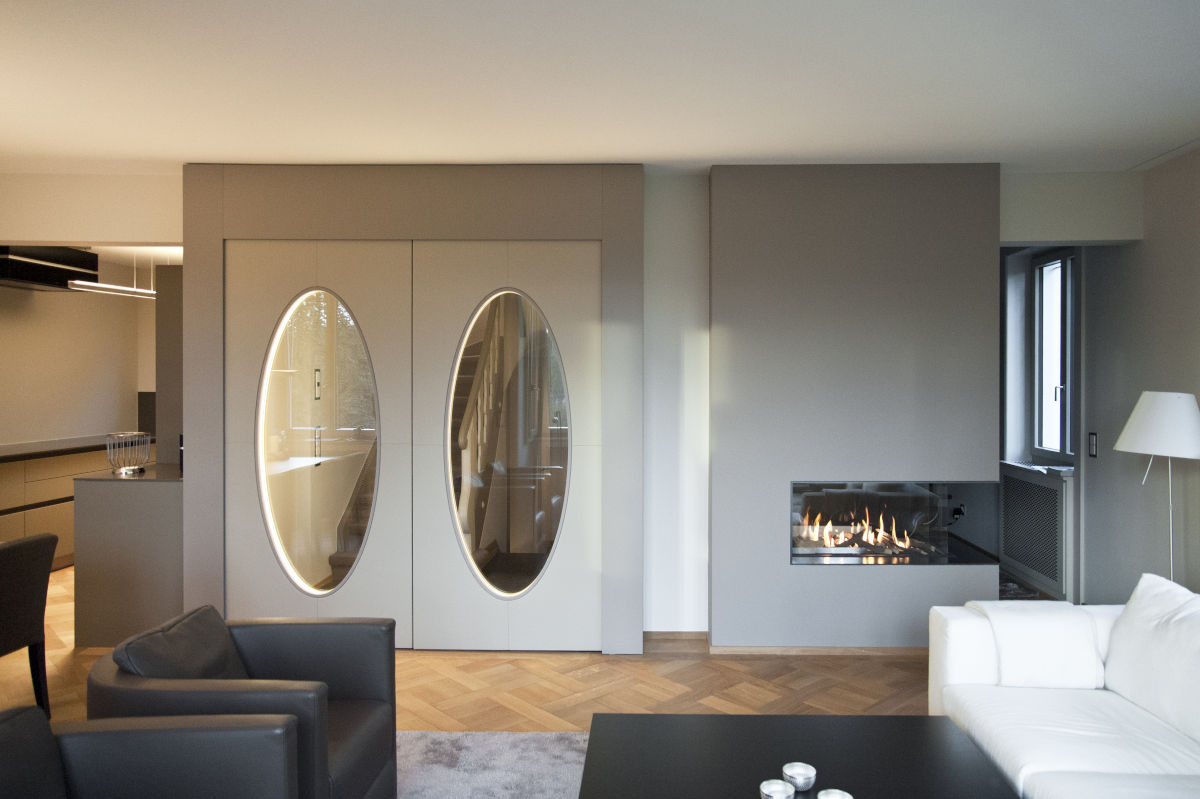 Regarding the conversion of old buildings, both the existing structure as well as the inhabitants tell their own story. “To continue with that story is a commitment and to retrieve and interpret these stories and make that visible is the essence of our architecture,” Nyberg states. For a modernisation project of a 100-year-old house in Zurich, a generously laid out downstairs living area impresses with carefully restored oak parquet floors. White, leather-clad doors with oval glass inserts feature LED lighting bands, thus functioning as an indirect lighting source. The library is situated behind the fireplace, with the cosy fire visible from both sides.