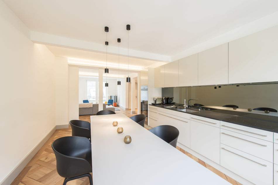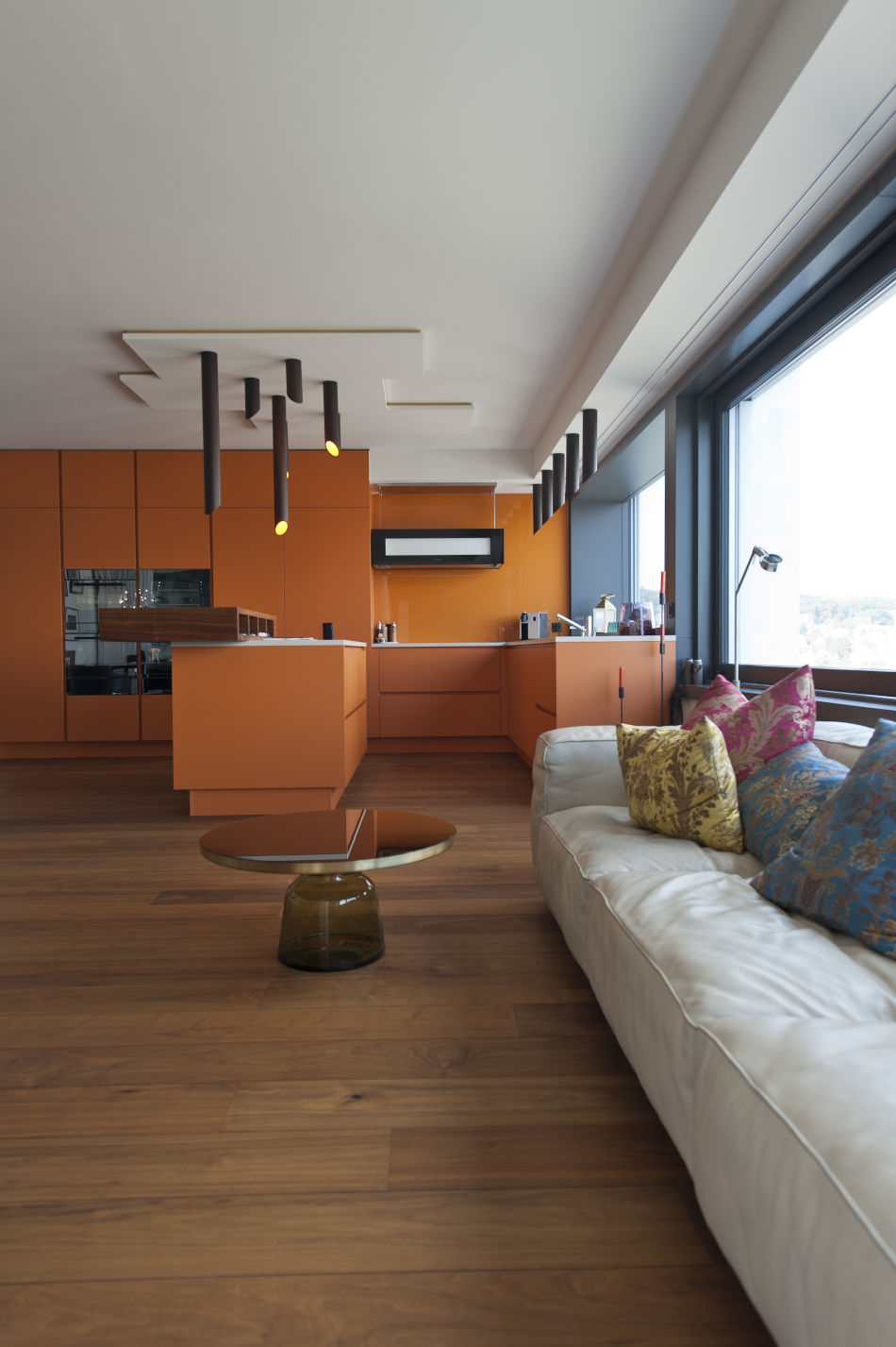 Exchanging ideas and designs within the team forms an important contribution to each project at the Juho Nyberg office. “Sometimes,” says the architect, “another person’s vision is stronger and more convincing than your own.” With their individual adjustment project in a 3.5 room apartment on the 20th floor of the Zurich new ‘Hard Turm Park’ tower, displaying a stunning view across the city all the way to the Alps, the Juho Nyberg team show their knack for personalised interiors. An open kitchen, integrated into the living space, marks the centre of social interaction. While friendly, warm colours complement the dark walnut parquet of the floor, the cooking island features orange hues, illuminated by artfully assembled, vertical rod lamps. Cosy white couches with colourful cushions accentuate the line of windows, displaying expansive views.